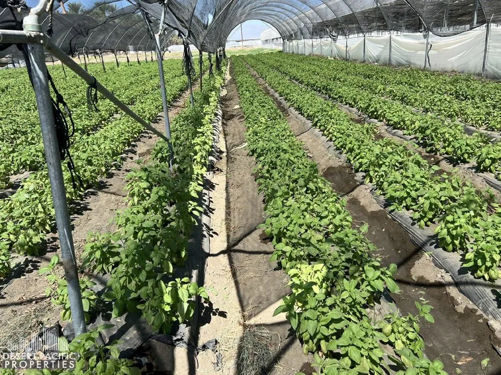 Prime organic agricultural operation in the Coachella Valley consists of: 8,000 sf packing building with 2 evaporative coolers with 1,800 sf walk-in cooler (50×36)/freon cooler (38- 40), three 14′ roll-up doors, and loading dock. 8 greenhouses. 1.25 acre each. 21 mesh houses. 6 tunnels. 4,800 sf shop building with two 14 ft roll-up doors and germination room. Modular office building with 3 offices. Mobile home for caretaker unit (not included in the sale). Two wells, (approx. 100) 4 pumps, filter station, and reservoir. Low cost abundant Coachella Valley Water District (CVWD) irrigation water and two wells. Easy access to Expressway 86. In Federal Opportunity Zone, with potential for tax benefits. In Agricultural Preserve, which maintains low property taxes. NNN charge: TBD. Appointment only. Call Susan Harvey at 760-250-8992.