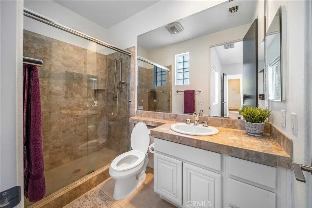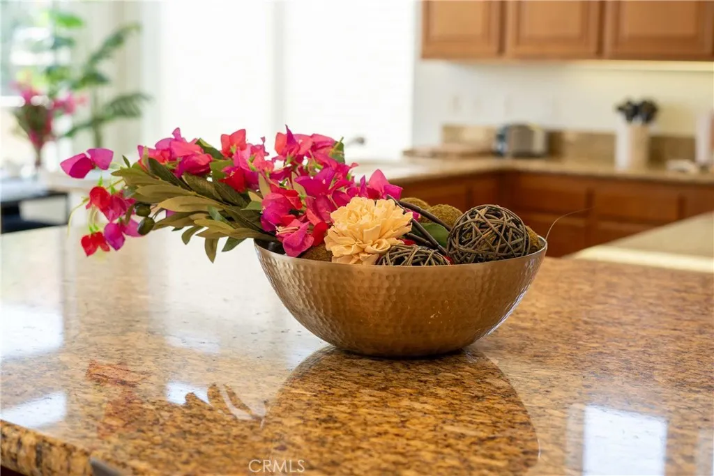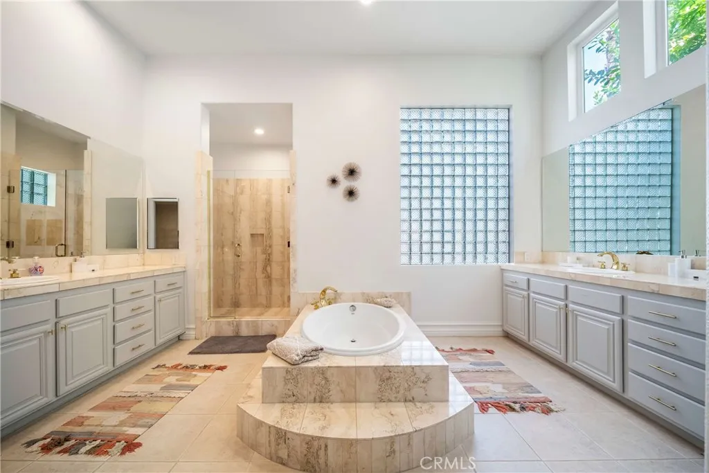 Inside, the home’s open floor plan is bathed in natural light, with soaring 14-foot ceilings and floor-to-ceiling windows offering stunning views of the 12th fairway. The expansive kitchen opens to the family room and features a large two-tiered island with bar seating, making it a central hub for gatherings. With three bedrooms and a den/office that could serve as a fourth, plus a detached casita with a private bath, this home offers ample space and privacy.