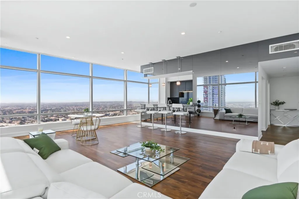 The unit has breathtaking city views of the 6th Street Bridge to the East, direct views of the Crypto Center and Palos Verdes Rolling Hills to the South, and Century City lights to the West.