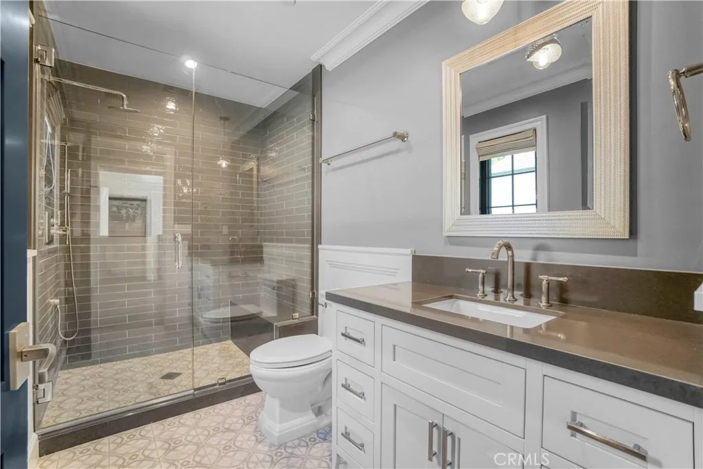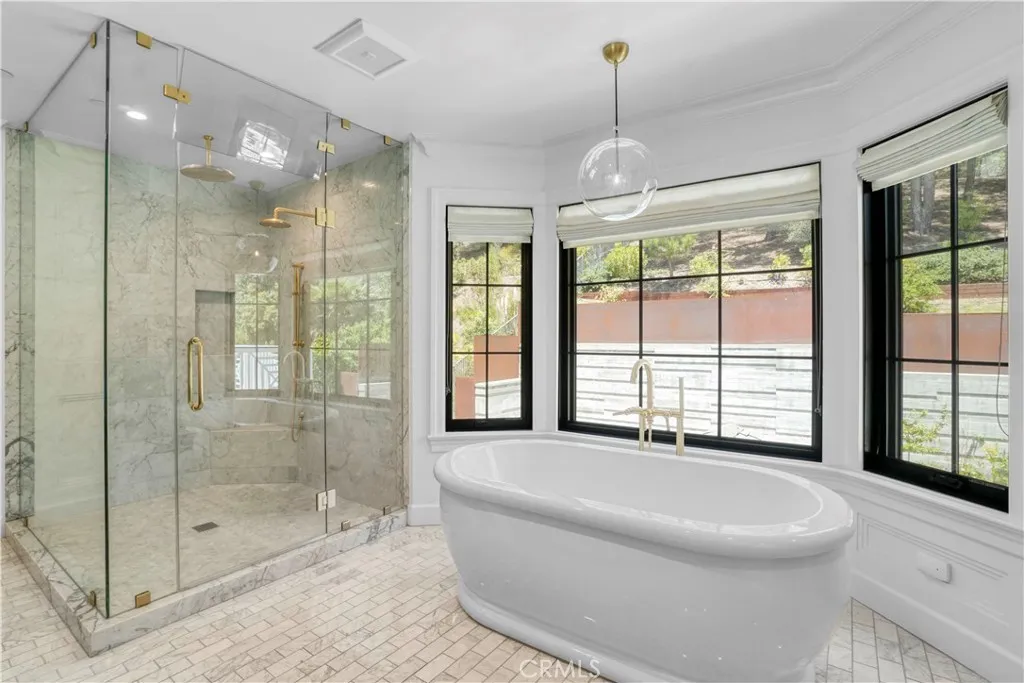North of Sunset delivers you this stunning Modern Farmhouse estate in Brentwood Hills. Open space living and balconies, this amazing home showcases elegant hardwood floors throughout, generous use of stone and quartz, designer fixtures and finishes, the main floor open living space include a gourmet kitchen, formal dining room, great living room, a family room with bi-fold expansive doors that open completely to the covered heated patio, pool, BBQ and a contemporary entertaining area. A ground floor movie theater, a home office and a full bedroom suite finish the main floor with no steps. Upstairs the oversized primary retreat features vaulted ceilings, a marble fireplace, a large balcony with mountain views, a gorgeous custom closet and a spa retreat bathroom. In addition, upstairs, there are three large bedrooms, a library sitting reading area with the same unbelievable views. The primary suite overlooks the infinity pool, a fire pit, the outdoor cooking area, and the covered heated patio. The three car garage is completely finished, with overhead lighting and security. Keypad smart home controls and a solar system throughout. Within the Kenter Canyon School and Palisades Charter district, surrounded by outdoor tranquil landscape.