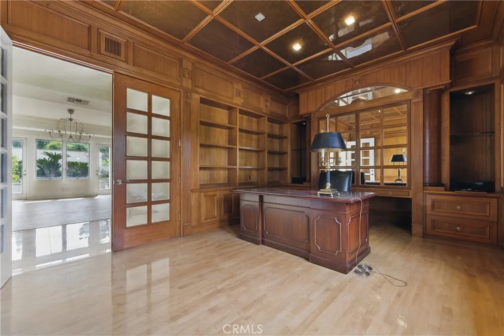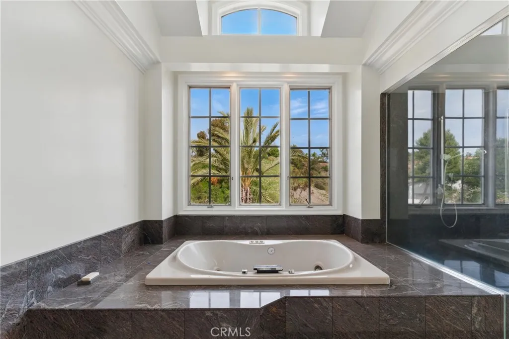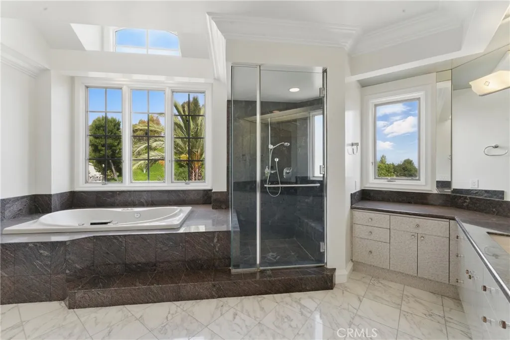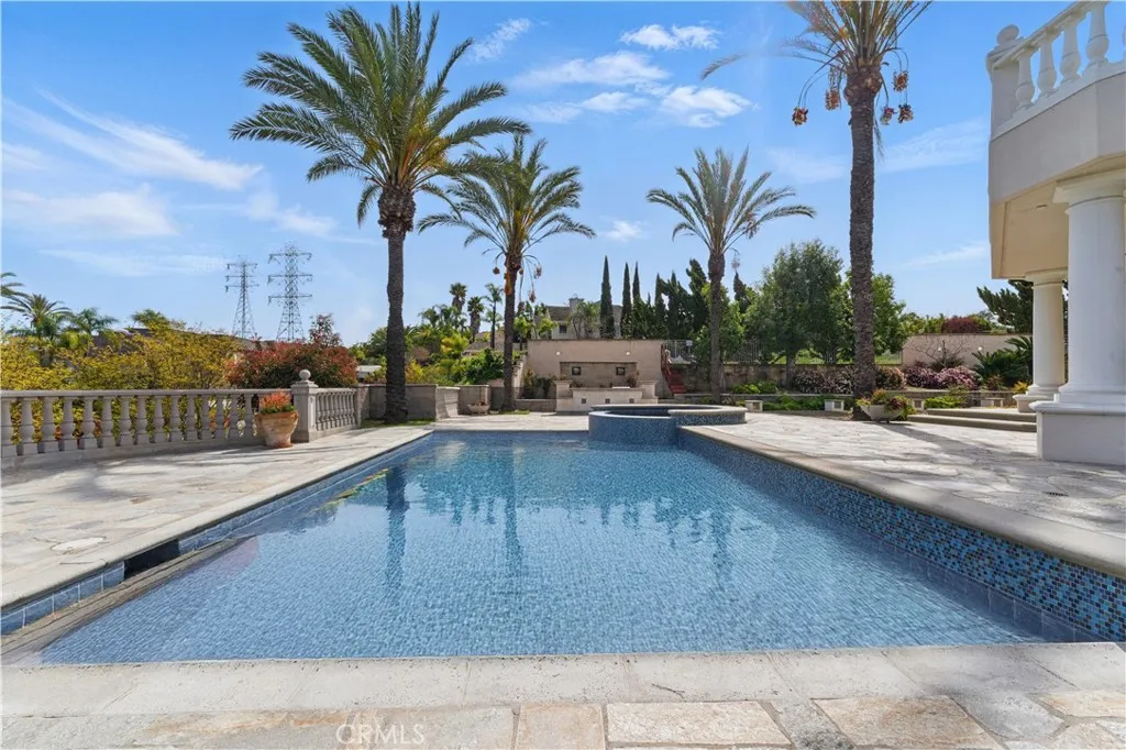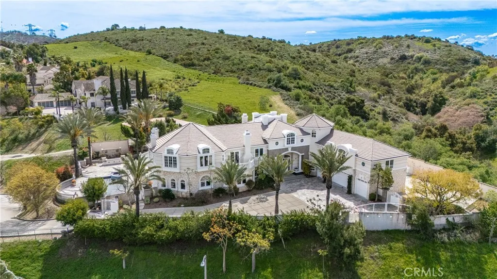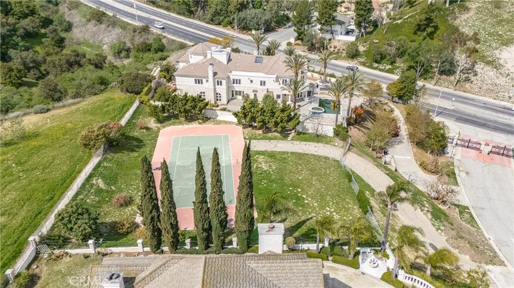 This extraordinary estate, is a rare opportunity in the exclusive, gated Skyline Estates community. This offering includes two premium parcels with separate APNs:Lot 1 – A grand custom-built estate spanning 10,477 sq. ft. on an expansive 46,451 sq. ft. lot.Lot 2 – A 27,493 sq. ft. vacant lot featuring an old tennis court, offering potential for development or personalization.A private, tree-lined driveway leads to this magnificent estate, where luxury and tranquility blend seamlessly. The home features 8 en-suite bedrooms and 9.5 bathrooms, designed for both comfort and sophistication. The striking double-height foyer, illuminated by skylights and a stunning chandelier, sets the tone for an interior adorned with marble and tile flooring, hand-crafted woodwork, and European-inspired lighting. The formal living and dining rooms showcase coffered ceilings and statement stone fireplaces, while a stately library with rich wood paneling and built-in shelving offers a distinguished retreat. The chef’s kitchen is well-appointed with a center island, stainless steel appliances, a wet bar, granite countertops, a walk-in pantry, and a cozy breakfast nook with a built-in desk.Three primary en-suites serve as private sanctuaries, featuring walk-in closets, cedar paneling, Jacuzzi tubs, dual-sink vanities, and separate showers. Two elegant staircases with solid wood steps and hand-painted wrought iron railings lead to an upper level designed for entertainment and relaxation, complete with 7 en-suites, a den, a secondary family room, and an expansive entertainment lounge with built-ins, a reading nook, and game areas.The third level offers a serene Japanese tatami tea room and a dedicated yoga space for ultimate relaxation.Outside, the resort-style backyard boasts a pebble-finish pool and spa, stone railings, multiple seating areas, and lush landscaping filled with mature palm trees and vibrant flowers. The property also includes a 4-car garage, generous driveway parking, and space for an RV or basketball court.Sweeping canyon and city light views can be enjoyed from nearly every window, creating a breathtaking backdrop. With a meticulously designed layout, 5-zone A/C, and endless possibilities with the additional lot, this estate offers a rare opportunity in one of the area’s most desirable communities.