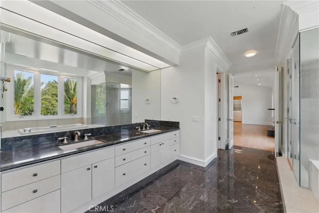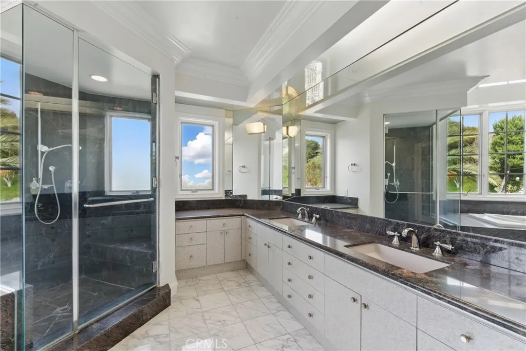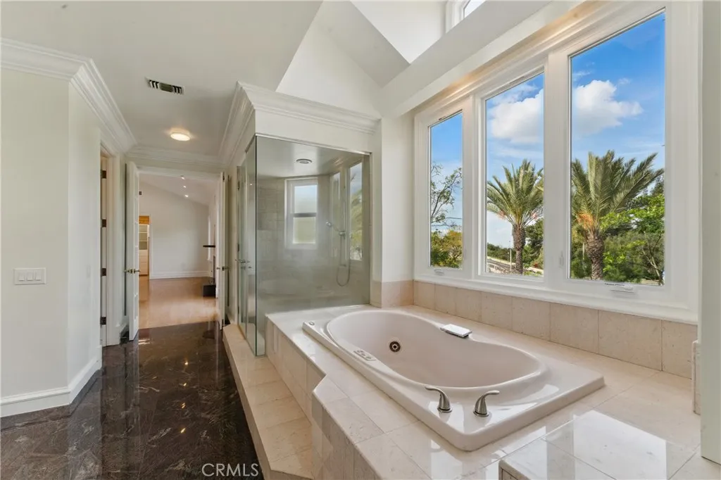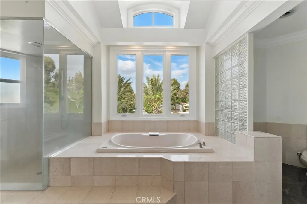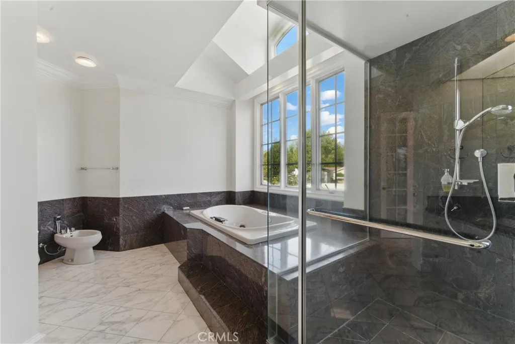 This extraordinary estate, is a rare opportunity in the exclusive, gated Skyline Estates community. This offering includes two premium parcels with separate APNs:Lot 1 – A grand custom-built estate spanning 10,477 sq. ft. on an expansive 46,451 sq. ft. lot.Lot 2 – A 27,493 sq. ft. vacant lot featuring an old tennis court, offering potential for development or personalization.A private, tree-lined driveway leads to this magnificent estate, where luxury and tranquility blend seamlessly. The home features 8 en-suite bedrooms and 9.5 bathrooms, designed for both comfort and sophistication. The striking double-height foyer, illuminated by skylights and a stunning chandelier, sets the tone for an interior adorned with marble and tile flooring, hand-crafted woodwork, and European-inspired lighting. The formal living and dining rooms showcase coffered ceilings and statement stone fireplaces, while a stately library with rich wood paneling and built-in shelving offers a distinguished retreat. The chef’s kitchen is well-appointed with a center island, stainless steel appliances, a wet bar, granite countertops, a walk-in pantry, and a cozy breakfast nook with a built-in desk.Three primary en-suites serve as private sanctuaries, featuring walk-in closets, cedar paneling, Jacuzzi tubs, dual-sink vanities, and separate showers. Two elegant staircases with solid wood steps and hand-painted wrought iron railings lead to an upper level designed for entertainment and relaxation, complete with 7 en-suites, a den, a secondary family room, and an expansive entertainment lounge with built-ins, a reading nook, and game areas.The third level offers a serene Japanese tatami tea room and a dedicated yoga space for ultimate relaxation.Outside, the resort-style backyard boasts a pebble-finish pool and spa, stone railings, multiple seating areas, and lush landscaping filled with mature palm trees and vibrant flowers. The property also includes a 4-car garage, generous driveway parking, and space for an RV or basketball court.Sweeping canyon and city light views can be enjoyed from nearly every window, creating a breathtaking backdrop. With a meticulously designed layout, 5-zone A/C, and endless possibilities with the additional lot, this estate offers a rare opportunity in one of the area’s most desirable communities.