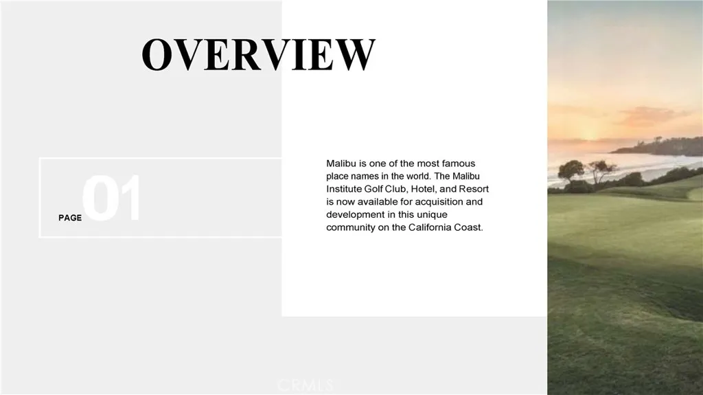 Iconic Malibu’s ultimate legacy: “The Malibu Institute,” formerly Malibu Country Club. Approximately 650-acre fully entitled California coastal estate, master-planned for Southern California’s most exclusive golf resort, wellness sanctuary, and world-class wedding and event destination. LAST APPROVED development of its kind and scale in the Santa Monica Mountains—irreplaceable. Final Tract Map (TR071735-3) recorded June 2023; all primary entitlements secured (Coastal Permit effective, extensions current). “Shovel-ready.”
