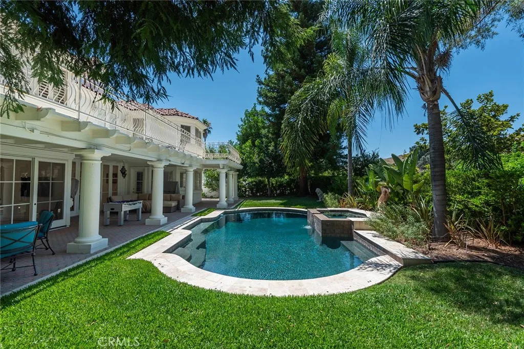 Located in the exclusive guard gated community of Mountain View Estates this furnished 6 bedroom 6 bathroom home offers 6158 sq ft of attractive living space on a corner lot with a circular driveway on a cul-de-sac street. The dramatic 2 story entry features marble floors, crystal chandelier and sweeping wooden staircase. Immediately upon entering you are drawn to a beautiful formal dining room with a crystal chandelier and a wall of windows/doors showcasing the lush backyard and pool. The oversized family room offers built-in cabinets, fireplace, sunken wet bar and hardwood floors. The generous size kitchen has white cabinets, granite countertops, center island, walk-in pantry, marble floors and a large breakfast room. The formal living room boasts a fireplace, gleaming crystal chandelier and marble floors. There is a bedroom suite downstairs with a large bathroom that can also serve as a pool bath with a door to the outside. Upstairs there are 5 bedrooms, all with hardwood floors. The primary suite has a gym area, balcony, fireplace, 2 walk-in closets, and a grand bathroom with dual vanities, spa tub, large shower, and a bidet. The inviting backyard features a large covered patio, pool, spa, and grassy lawns. This beautiful property is being leased furnished short term for 3-6 months. Located in the award winning Las Virgenes school district and convenient to shopping, fine dining, and a short drive to Pepperdine University and the beaches of Malibu.