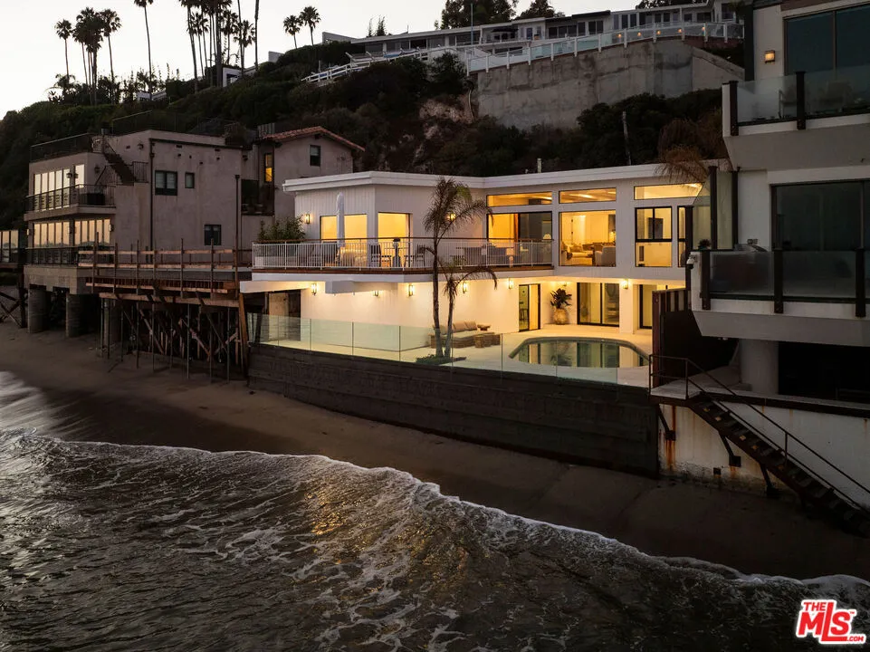 Situated off of PCH on the Private Escondido Beach Road, sits this Mid-Century gem on 50 feet of the exclusive and coveted Escondido Beach. Embrace the opportunity to own this special property that has been extensively and meticulously reimagined by design team Warren Garrett. The newly completed home elegantly blends timeless materials with modern amenities and exudes a restrained sophistication. The turnkey beachfront residence offers 4 bedrooms, 4.5 baths, two levels of expansive waterfront decks and features a gorgeous french grey plaster pool that takes center stage only a few steps from the sand. This idyllic beach house is conveniently located steps away from the iconic Geoffrey’s restaurant and a leisurely beachside stroll to Paradise Cove Beach Cafe. Located near the end of a private street, the peaceful retreat enjoys ample separation from Pacific Coast Highway. The clean design of the modest exterior facade is centered by an arched solid steel front door opening to panoramic ocean views framed with white oak floors and soaring exposed beam ceilings. An open gourmet kitchen showcases a grand Italian limestone island, exquisite stone shelving, a La Cornue range and new high end appliances. The main level features 3 bedrooms with spa-like en-suite bathrooms, while the lower level offers a 4th bedroom and full bathroom with breathtaking views of the pool and ocean beyond. A secondary bar and kitchen as well as a cozy interior lounge were designed to make this the perfect setting for pool and beachside entertaining. The home may be sold furnished and is move-in ready with brand new furnishings from Jenni Kayne Home, experience the best of coastal living in this unique Malibu beachfront paradise.
