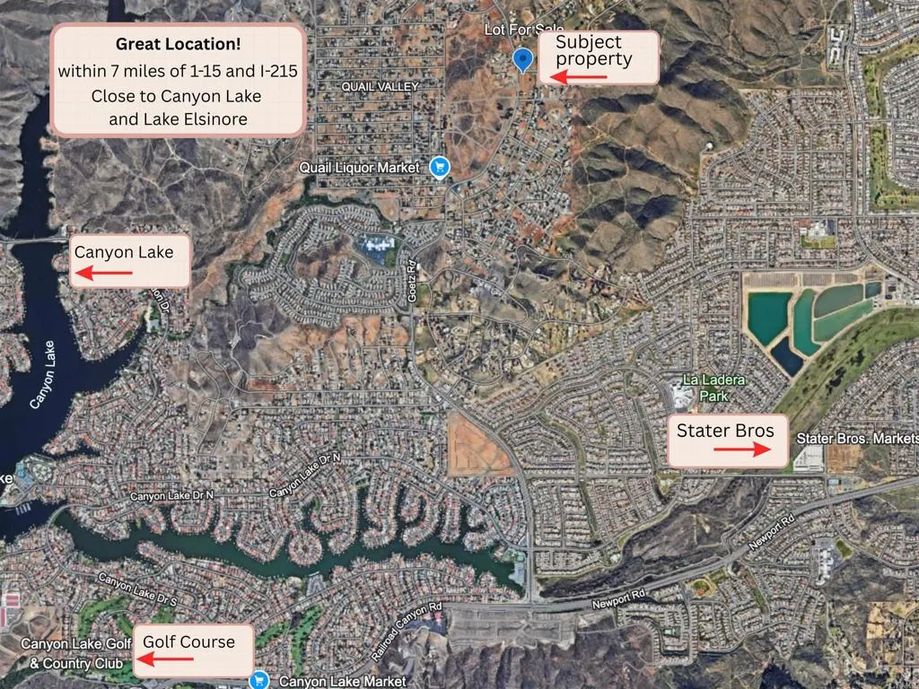 Zoned Commercial and perfectly positioned on the corner of Goetz Rd & S Canyon Dr, this flat and fully usable 1.14-acre parcel offers exceptional visibility in a rapidly developing area of Menifee. Utilities are available at the street, with a sewer connection expected soon. Just minutes from major freeways, Lake Elsinore, Canyon Lake, and a variety of recreational activities—including water sports, hiking trails, a nearby country club, restaurants, and shopping—this location blends accessibility with lifestyle appeal. Ideal for a range of businesses such as a bakery, outdoor vendor plaza, equipment sales, or a neighborhood grocery store, this lot is a fantastic opportunity for both owner-users and investors. Bonus: The seller is open to a potential trade involving a residential property—perfect for those looking to exchange into a strategically located commercial site. Buyers to verify all zoning and permitted uses with the City of Menifee.