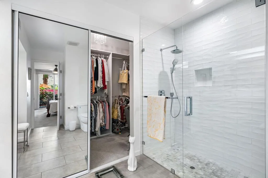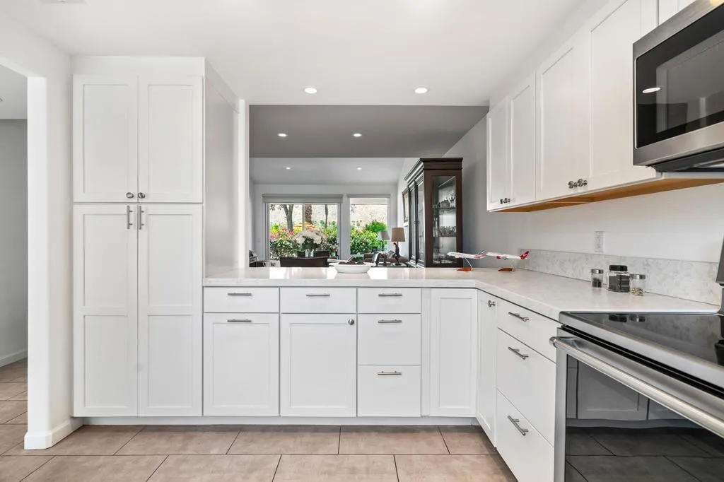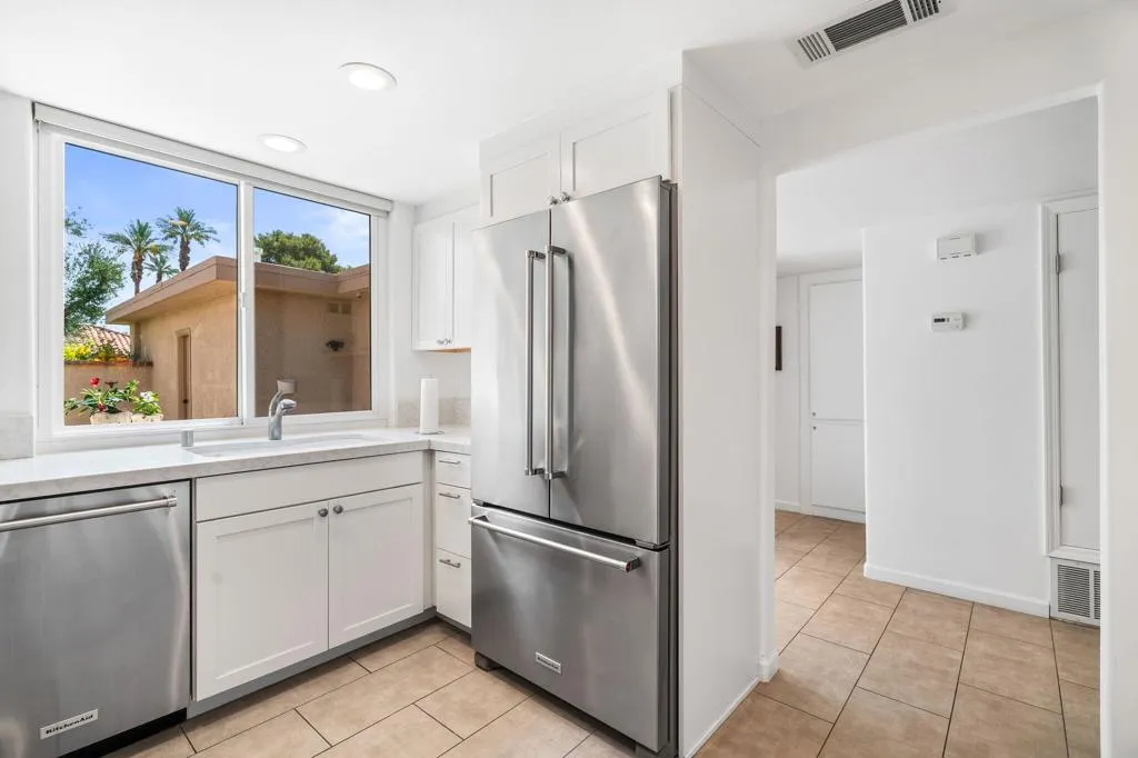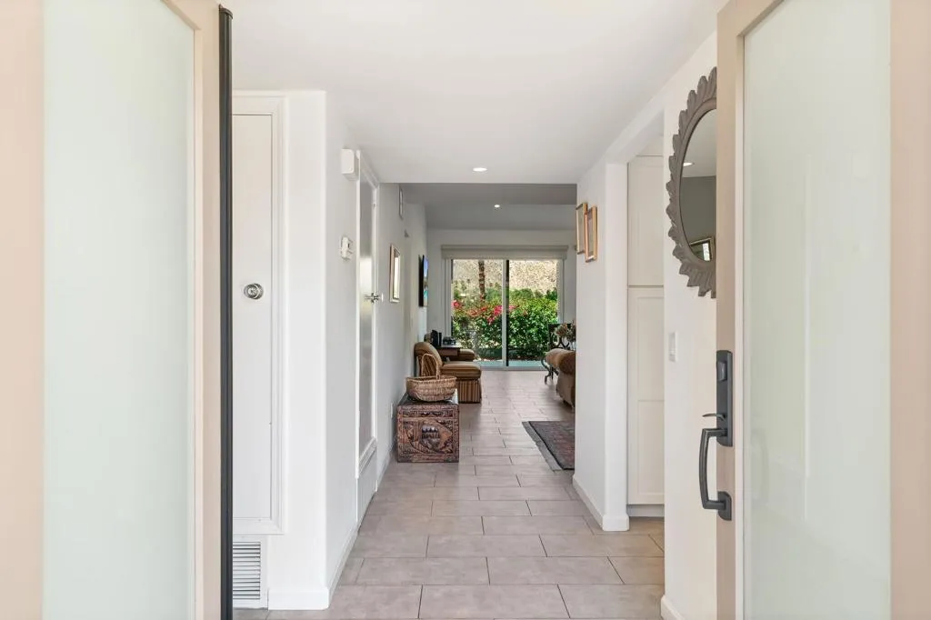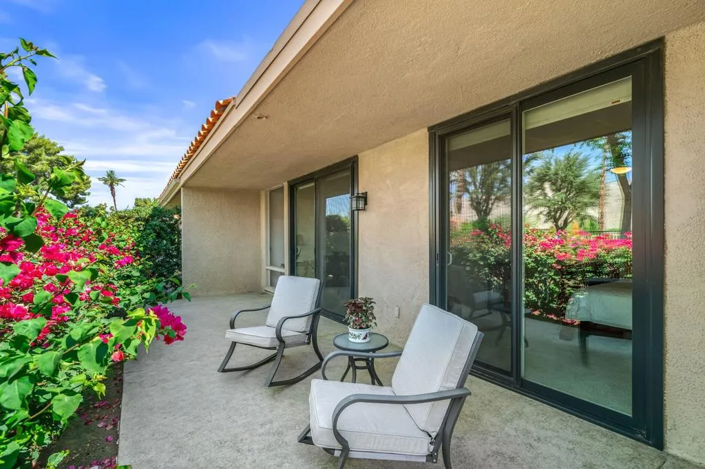 Amazing views from this Premium Location in the Sunrise Country Club, with the backyard patio facing a Panoramic view of Mountain Scenery. This elegant home has 2 spacious Bedrooms with private bathrooms, and views of mountains or the serene courtyard. Step through the front gate into the courtyard with an artistic garden. Living Room with vaulted ceilings and a wall of windows, which offers stunning mountain and community greenbelt views. Recently remodeled Kitchen features quartz counters, newer cabinetry, stainless-steel appliances, and a breakfast bar. Inviting Owner’s Suite has a large walk-in closet, plus a built-in workstation. Elegantly remodeled Bathrooms feature quartz counters, newer cabinetry, shower tile & glass enclosures. Newer designer flooring throughout, and remodeled garage with laundry area. The picturesque Backyard patio provides a perfect setting for entertaining, and a short distance to an association pool & spa.