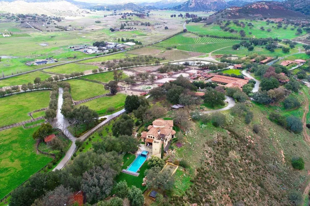 Perched on 170 acres with sweeping valley views, Ballena Vista is a rare luxury estate offering elegance, privacy, and self-sufficiency. The custom home, built by Dave McGinnis, features exceptional craftsmanship and upscale finishes. With 40 acres of grape varietals, room for expansion, and existing structures ideal for a future winery. Additional accommodations include a guest house, 3 casitas, and 5 modular homes—perfect for guests or staff. Equestrian facilities include a luxury 8-stall barn and a separate 38-stall barn, offering endless versatility. A private well system and expansive solar farm support sustainable living. Truly one of San Diego County’s premier estates, Ballena Vista offers a lifestyle beyond limits, with sweeping views, world-class amenities, and timeless appeal. Located just a one-hour drive from Downtown San Diego. The property includes plenty of water, w/ 7 wells and a 400,000 underground storage reservoir for irrigation as well as a 50,000 gallon and two, 10,000-gallon storage tanks for potable water. There is a pump station distributing water to the various pastures and vineyards. The electricity is provided by its own solar field, the 2nd largest private solar field in San Diego County. There remains plenty of room for horses with some of the finest barn facilities anywhere and spacious fenced pastures for turning them out. There’s even a quarter mile racetrack to stretch their legs. Whether a full-time residence or a weekend getaway this is one of the premier estates in San Diego County. Ballena Vista is more than a home—it’s a private sanctuary, a working estate, and a rare investment in lifestyle and legacy. Without question, one of San Diego County’s most remarkable properties.