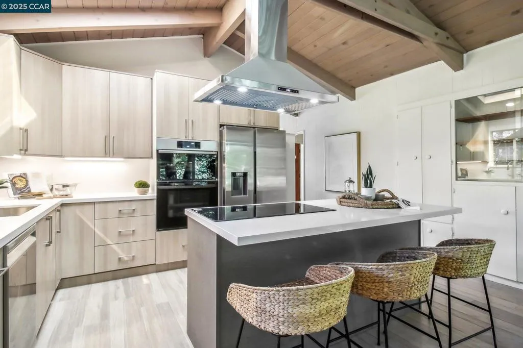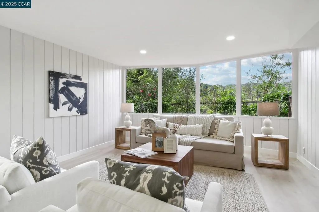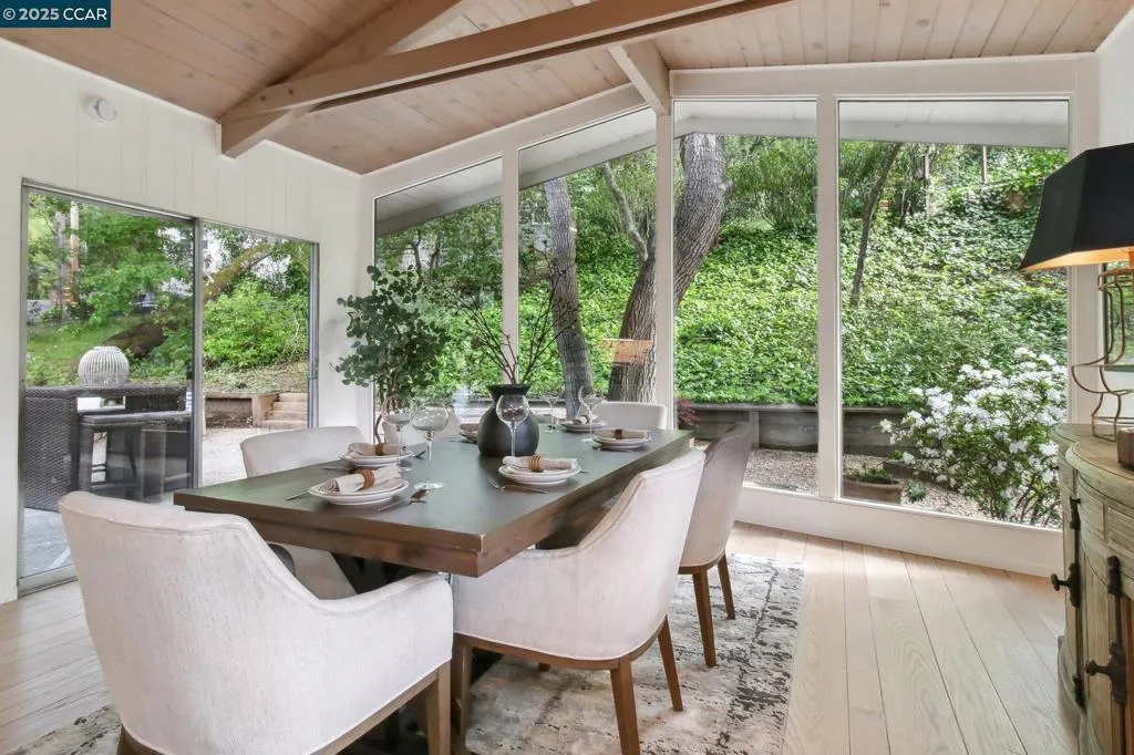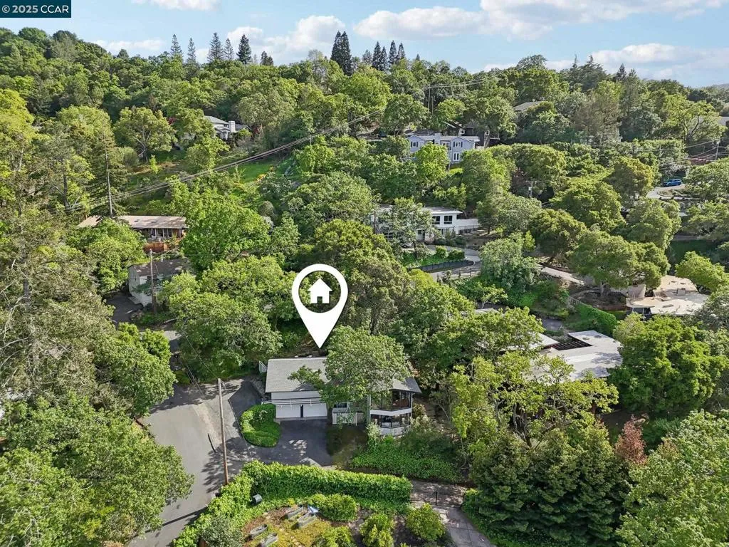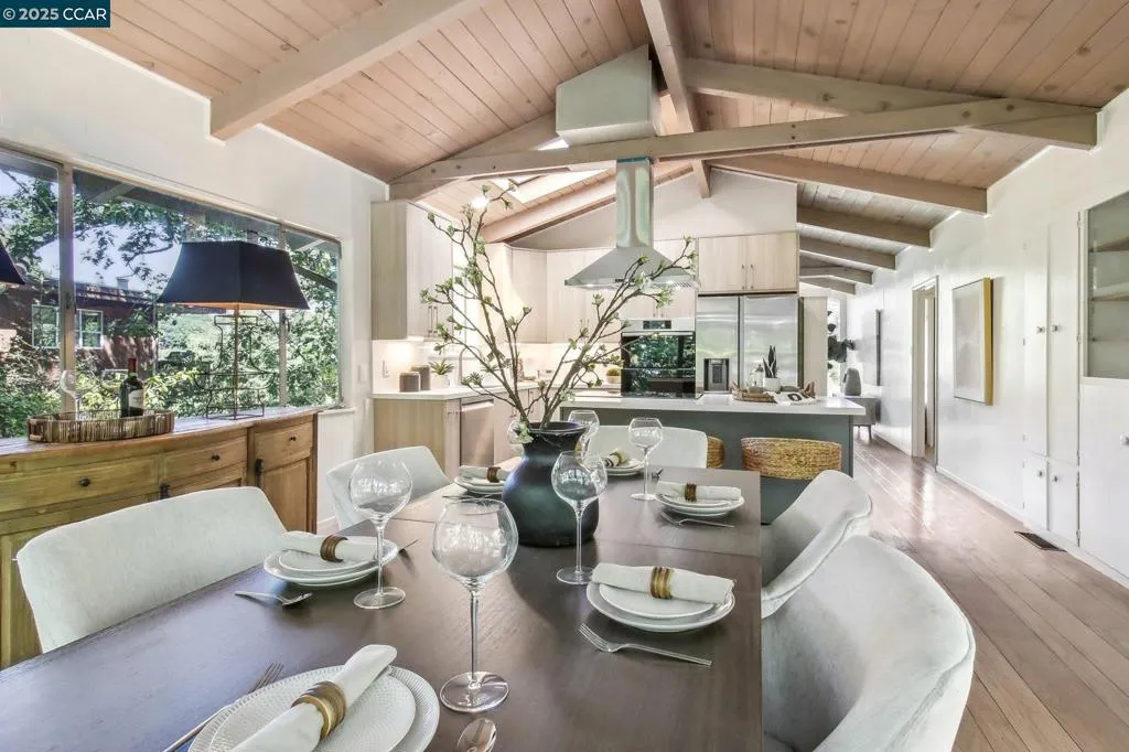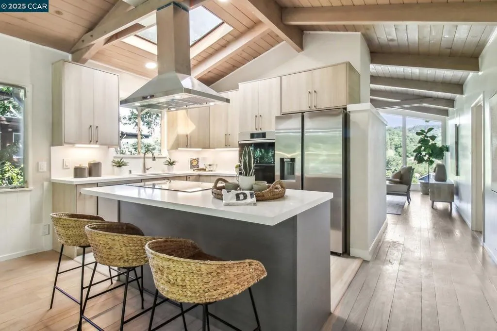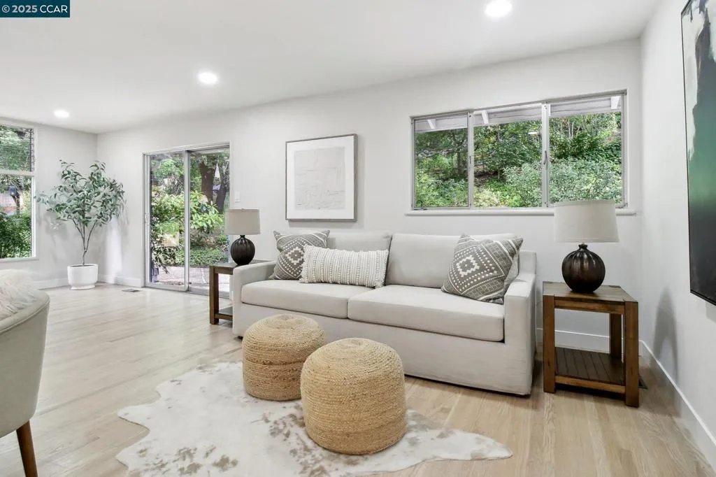 Amazing Value in Orinda! This stunning 3-bedroom, 3-bath home offers 2,486± sq ft of beautifully renovated living space on a private 0.28-acre lot. The main level showcases a dramatic formal living room with a wall of floor-to-ceiling glass, sleek gas fireplace, and seamless flow into a brand-new chef’s kitchen featuring European cabinetry, quartz counters, new stainless steel appliances, and an induction range. The large dining rm is encased in more glass with yard access. The spacious primary suite is adorned with windows, seating area, and a spa-like bath with dual sinks and an oversized walk-in shower and completing the main level. Downstairs, discover a versatile and convenient kitchenette, cozy family room with fireplace, large bedroom, and full bath — ideal for multigenerational living, an au pair suite, or potential attached ADU/rental opportunity. Mature backyard landscape with coveted flat space and corner privacy. Every detail has been thoughtfully updated, including new kitchen, bathrooms, flooring, cabinetry, counters, lighting, and interior/exterior paint. Great location offering ultimate privacy while being close to town, schools, and commute routes.
