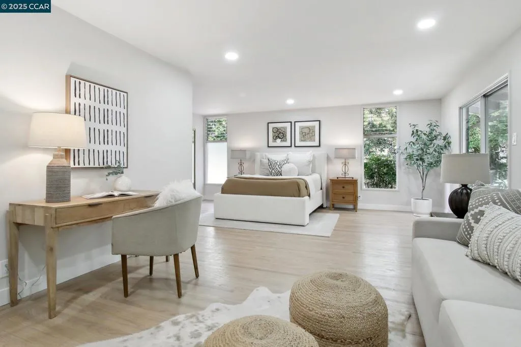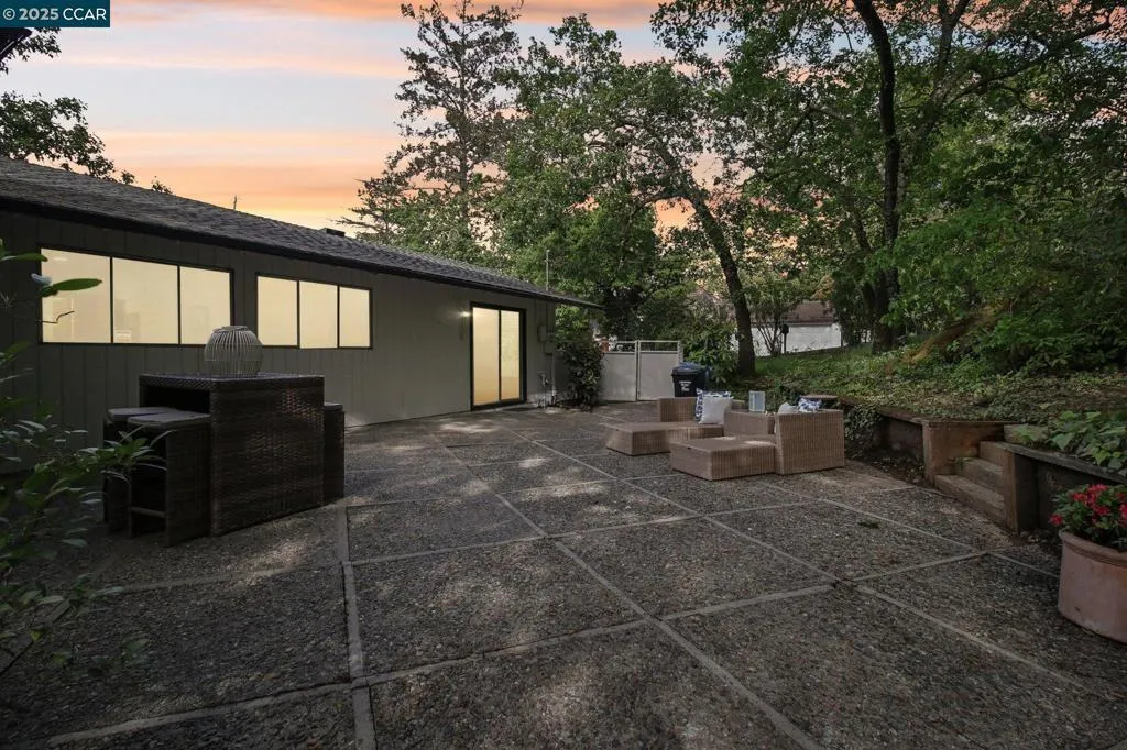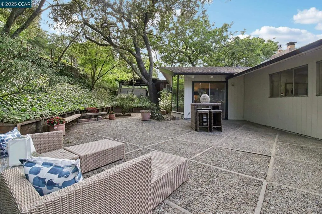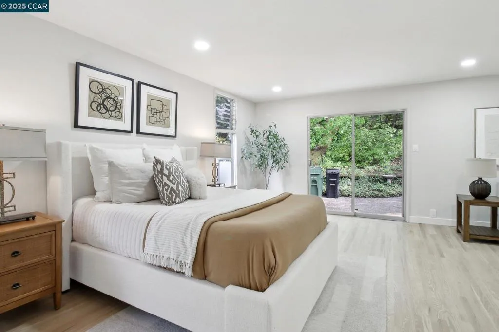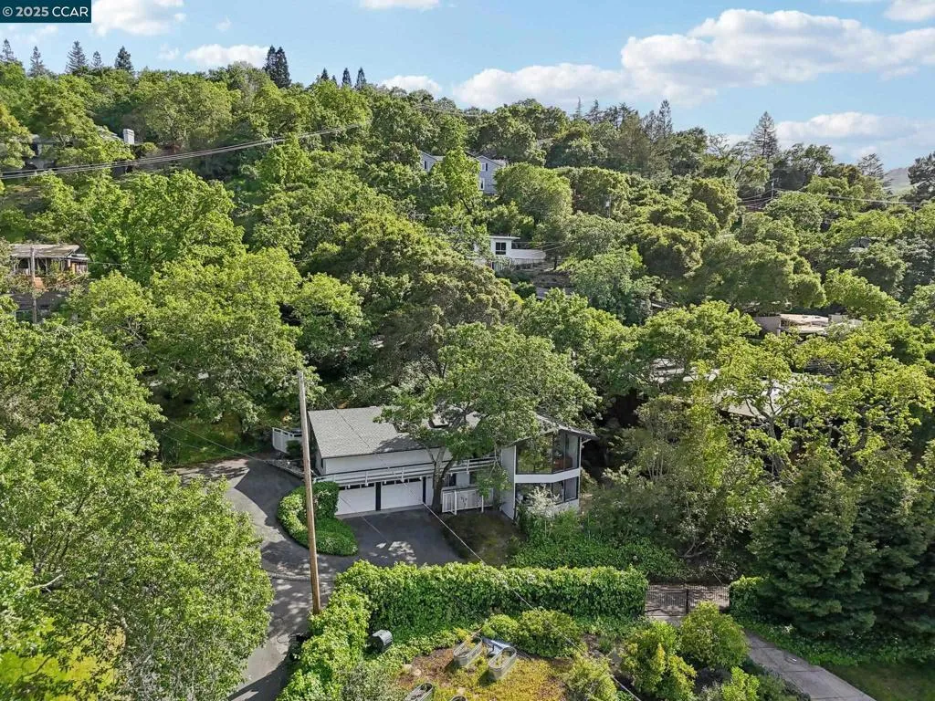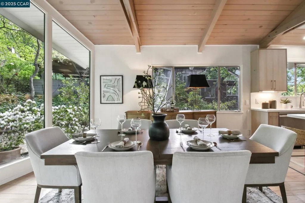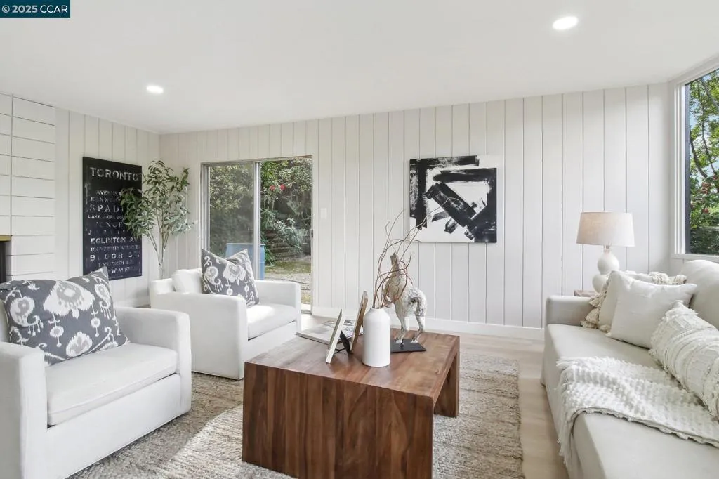 Amazing Value in Orinda! This stunning 3-bedroom, 3-bath home offers 2,486± sq ft of beautifully renovated living space on a private 0.28-acre lot. The main level showcases a dramatic formal living room with a wall of floor-to-ceiling glass, sleek gas fireplace, and seamless flow into a brand-new chef’s kitchen featuring European cabinetry, quartz counters, new stainless steel appliances, and an induction range. The large dining rm is encased in more glass with yard access. The spacious primary suite is adorned with windows, seating area, and a spa-like bath with dual sinks and an oversized walk-in shower and completing the main level. Downstairs, discover a versatile and convenient kitchenette, cozy family room with fireplace, large bedroom, and full bath — ideal for multigenerational living, an au pair suite, or potential attached ADU/rental opportunity. Mature backyard landscape with coveted flat space and corner privacy. Every detail has been thoughtfully updated, including new kitchen, bathrooms, flooring, cabinetry, counters, lighting, and interior/exterior paint. Great location offering ultimate privacy while being close to town, schools, and commute routes.