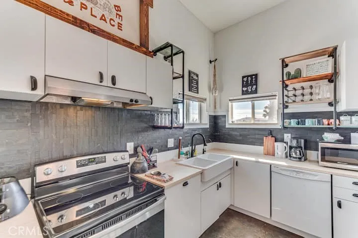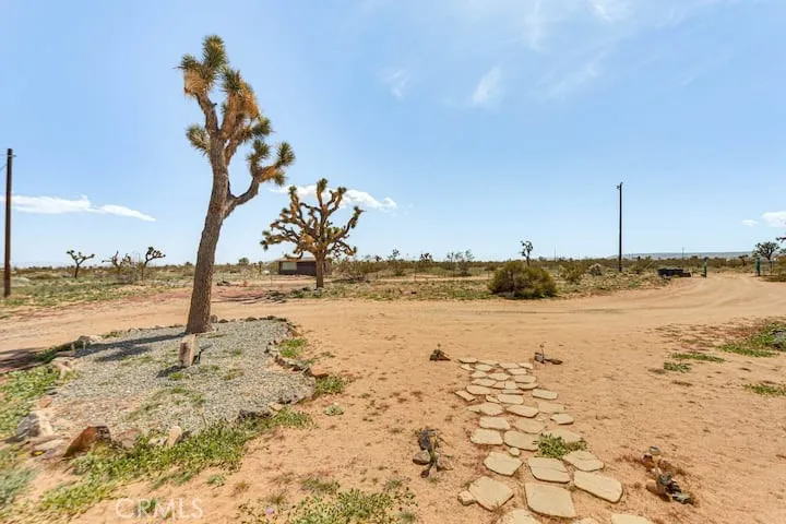This fully furnished 3 bed, 2 bath home with an open-concept layout with high ceilings and sleek concrete floors, offers modern touches with its rustic charm desert living. There are 2 bedrooms and 1 bath in the main house, and a separate 1 bed, 1 bath unit with it’s own entrance—perfect for guests, mother in law, or rental income. Nestled right in front of Goat Mountain in Landers, enjoy stunning views and peaceful surroundings under the Milky Way and beautiful desert skies in the jacuzzi. 2 acres of the 5 acre parcel is fenced so that you ca have pets or kids can play without you worrying, and there is a tool shed and additional electrical panel for any future projects of expanding the property. La Copine, The Integratron, OHV area in Johnson Valley, Joshua Tree, Giant Rock, and more are just a few minutes drive, and there’s a plethora of BLM land just out your back yard to the north east.