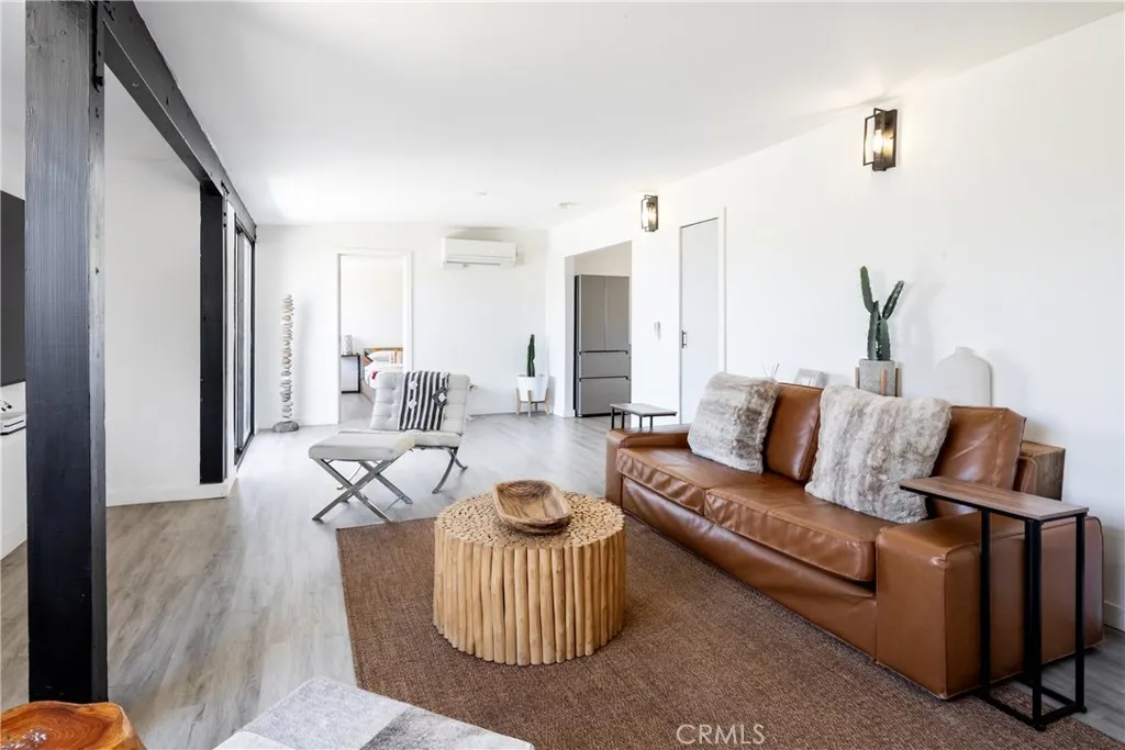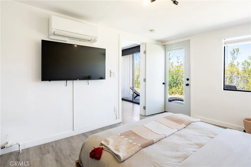 Step inside to discover a beautifully updated interior featuring warm, earthy tones, natural textures, and modern finishes that bring the outdoors in. The spacious living room is perfect for relaxing or entertaining, with a custom wet bar and sliding glass doors that frame the expansive desert landscape. Each bedroom includes its own mini-split HVAC system for personalized comfort, while the spa-inspired bathroom features a large, tiled walk-in shower.