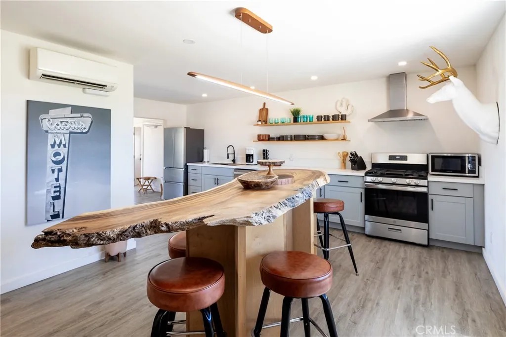 The open-concept kitchen is a showstopper—complete with quartz countertops, stainless steel appliances, open shelving, and a deep stainless steel sink. At the center is a 12-foot live-edge Hawaiian Monkey Pod island, ideal for preparing meals or gathering with family and friends.