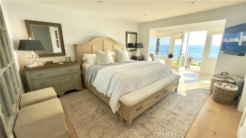 Spectacular Oceanfront retreat with panoramic Coastline views, overlooking The Montage Resort. This designer-decorated, turn-key beach getaway is tucked behind private gates on Camel Point – an exclusive enclave of just 11 homes just steps to the sand along one of Laguna Beaches’ longest stretches of coastline. Ideally located close to shops and restaurants (the entrance to the Ranch Resort and Golf Course is just across the way), shopping at Treasure Island Plaza, and steps to Laguna’s luxurious Montage Resort & Spa, which is just a quick stroll along the surf. Stroll along the sand to Pier One Cafe for a morning Beignet, lunch, or early dinner. All new and completely remodeled, this charming beach house is equipped with everything you need, just bring your suitcase! This light and bright upscale cottage has open-concept Living and Dining areas with forever ocean views to Palos Verdes. Enjoy Catalina Island Sunsets from every room! Beautiful architectural details throughout – from the wide-plank french white oak flooring, a stone-surround fireplace in the Living room, a gourmet “Chef quality” kitchen with an oceanview breakfast nook and top-of-the-line appliances including a French Lacanche Cluny gas range and double oven, custom marble countertops, and white custom cabinetry. A Butler’s pantry with a Wolf coffee station is perfect for creating your morning brew. This house is as functional as it is stylish and complete with Central Air and interior laundry. Step out to your wraparound deck and expansive outdoor patio area overlooking the picturesque whitewater views below. A main-level guest bedroom retreat opens to a courtyard garden patio and the two ensuite bedrooms (including a spacious Primary Suite) on the lower level open to an oceanside patio with Coastline and City light views. Let the waves lull you to sleep after a relaxing day sunbathing on the beach, paddleboarding, or surfing at one of Laguna’s famed surf spots. This is a special property with ample indoor/outdoor spaces and lots of privacy!