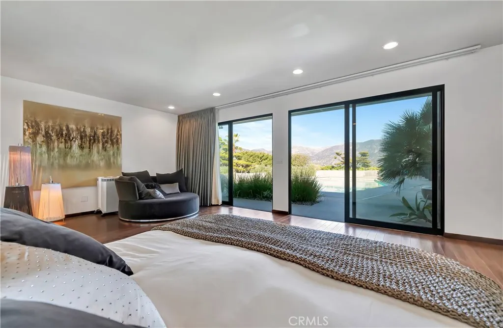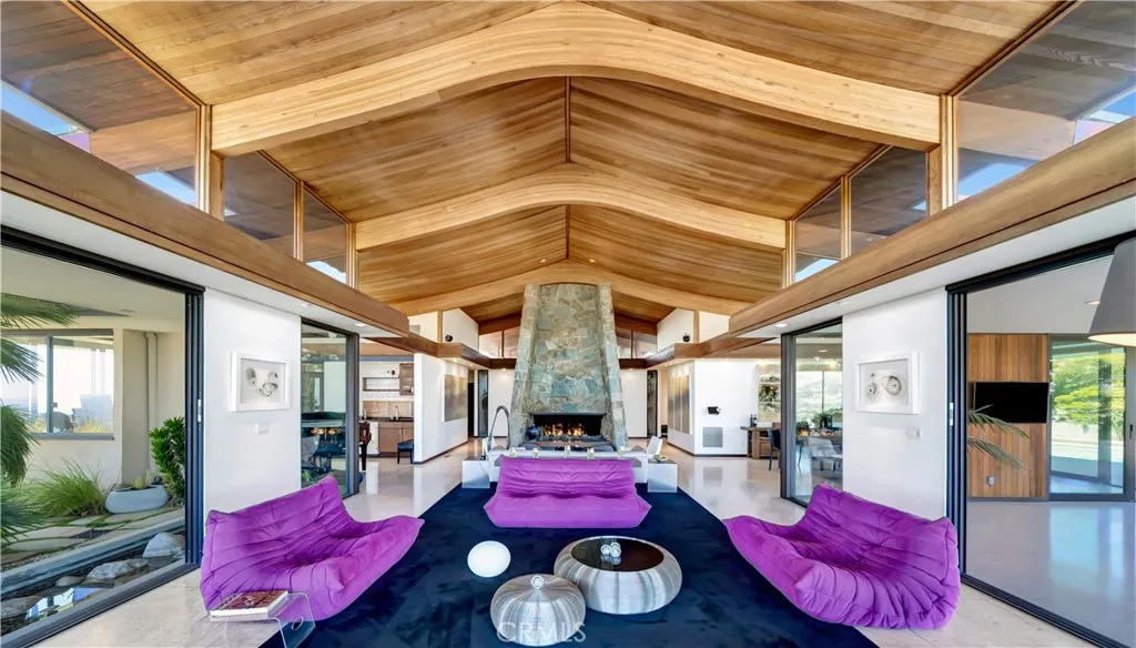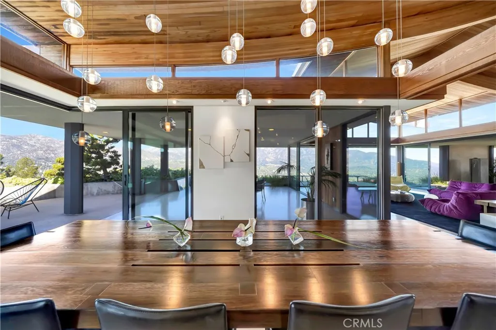 This spectacular mid-century modern masterpiece, built in 1966 by renowned architect Jack Simison with Frank Lloyd Wright influences, was exquisitely remodeled in 2013. The open floor plan, adorned with original terrazzo flooring, flows seamlessly from the interior to the exterior patio. Perched on a ridge, it offers breathtaking 270-degree views of the San Gabriel Mountains and JPL (NASA Jet Propulsion Laboratory). The unique roof design and bonsai-like trees create a striking East-meets-West aesthetic. The gated entry ensures privacy, leading to a stunning hexagonal pool, koi ponds, and Craftsman-style stained glass doors by Judson Studios. The property exudes a Zen ambiance, epitomizing the indoor-outdoor California lifestyle with curated landscaping and lighting. Inside, soaring redwood cathedral ceilings, expansive glass walls, and multiple entertainment spaces offer a private oasis. The front exterior features Pennsylvania blue Bouquet Canyon stone, guiding you to a dramatic fireplace that enhances the home’s organic, Arts and Crafts-inspired design, fusing rock, stone, concrete, and wood for a perfect blend of East and West influences.