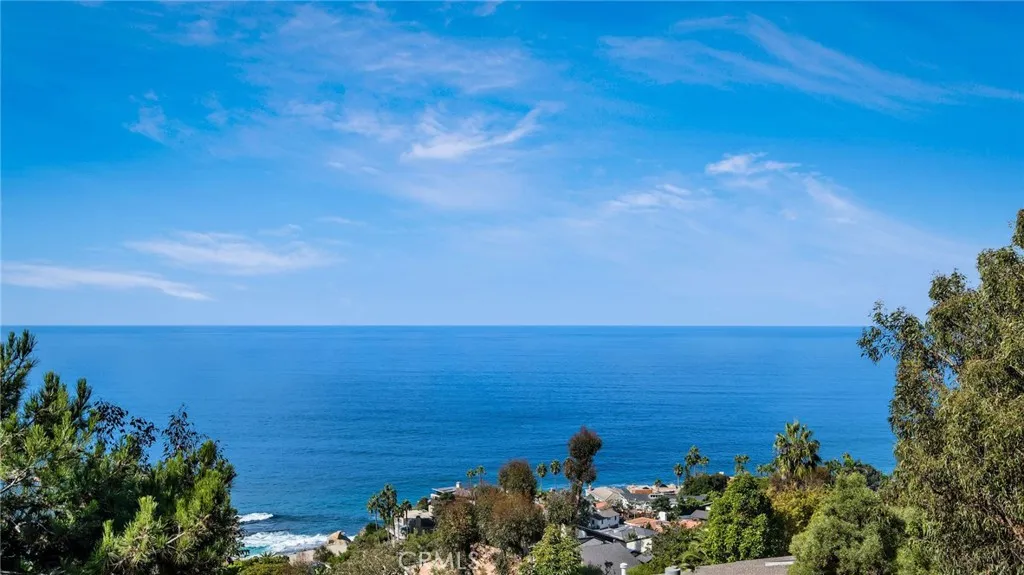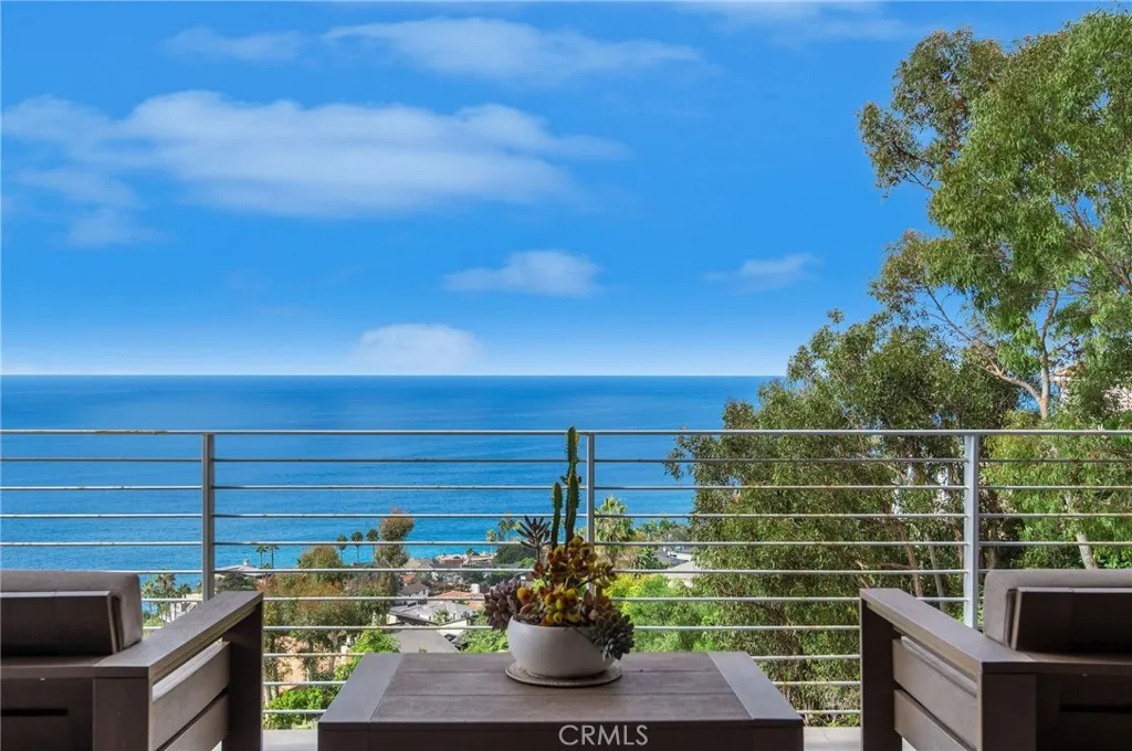 A contemporary, private coastal estate nestled into a hillside with awe-inspiring panoramic views of the Pacific Ocean, Catalina Island, and the city lights. The interiors of this home offer a pinnacle of current design, with high-end finishes and voluminous living spaces. Located off the entryway, the formal living room, anchored by a sleek fireplace, is flanked by accordion glass doors, allowing in bountiful light and ocean breezes. The great room comprises a more casual sitting area and an updated kitchen, offering the coveted open floor plan. Great for gatherings as well as relaxation, this space features soaring ceilings, a second fireplace, and access to a large deck with expansive views. Clean lines extend into the fully modernized kitchen with a central island, ample storage, a premium suite of stainless steel appliances, and access to the dining area for seamless entertaining. The adjacent balcony is large enough to accommodate a seating area, serving as an extension of the indoor entertaining space. The sleeping quarters are located on the lower level. An ocean-facing primary retreat encompasses a spacious bedroom with a fireplace, a balcony, a spa-like fully equipped bathroom, and a massive walk-in closet. All of the secondary bedrooms are ensuite and could serve as guest accommodations, a home gym, or an office. This property is surrounded by lush, mature landscaping, and its additional features include whole-house Sonos surround sound, Lutron lighting, a security system, an attached two-car garage, and a private driveway. While private, the location is convenient, with easy access to the city’s iconic beaches, the Montage Laguna Beach resort, local restaurants, and shopping.