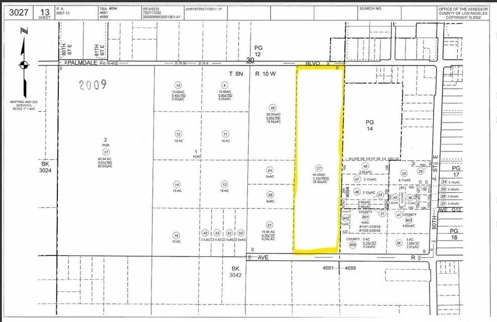 38.84 acre lot in the heart of the Sun Village area of Littlerock. The lot has 652 feet of paved frontage on Palmdale Blvd FROM 87th heading west and runs a half mile south to Ave R along Jackie Robinson Park . Zoned A21 for agriculture, animals. and a home. APN 3027-013-027.