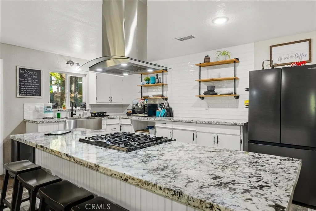 While the exterior maintains its charming cabin character, the interior has been beautifully updated. Enjoy modern laminate flooring, granite countertops, recessed lighting, newer appliances, and fresh paint throughout. The generous kitchen island with bar seating creates a perfect hub for cooking and entertaining.
