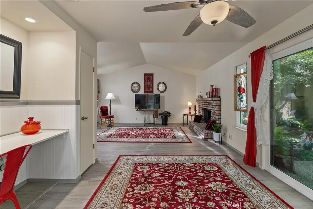 Step inside to a bright living room with a large window, 2 solar tube, a cozy gas fireplace, and direct access to the patios. The spacious primary bedroom features a sliding glass door to a private patio and an updated en-suite bathroom with a walk-in shower, large vanity, and modern fixtures. Both bathrooms have been tastefully remodeled with custom tile, new flooring, and upgraded tubs and showers.