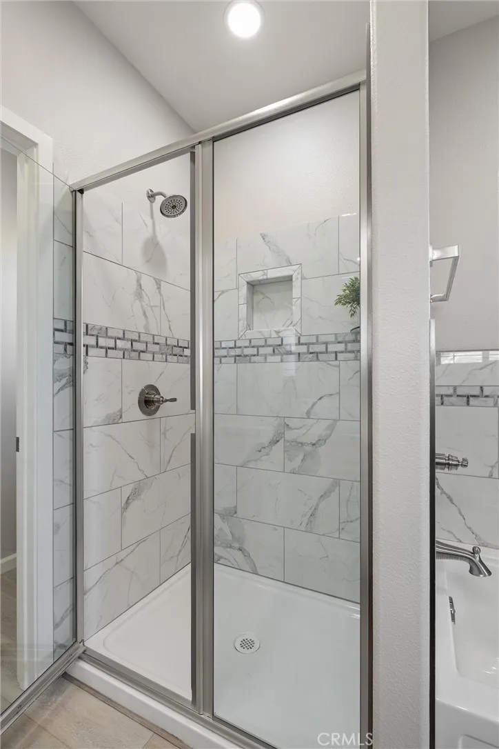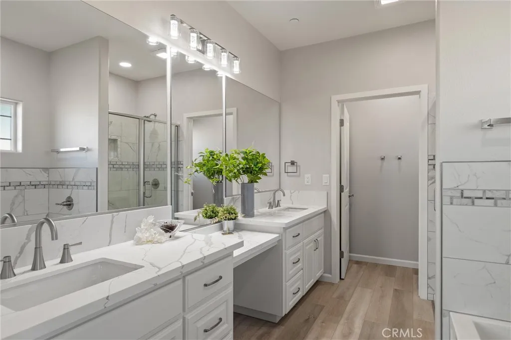 -The spacious ENSUITE PRIMARY bedroom features a walk-in closet, bathroom with separate tiled shower, a large 3’ x 6’ soaking tub, double sinks with quartz countertops, a vanity and a private water closet with storage cabinets.