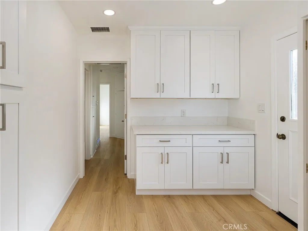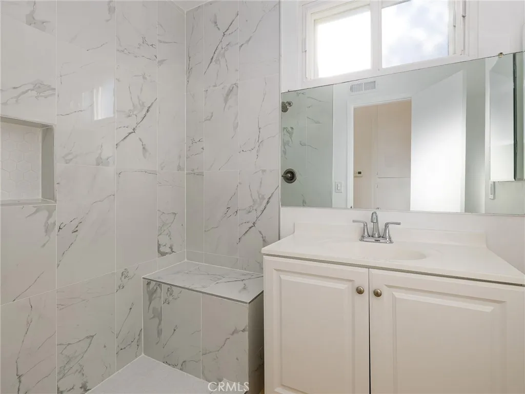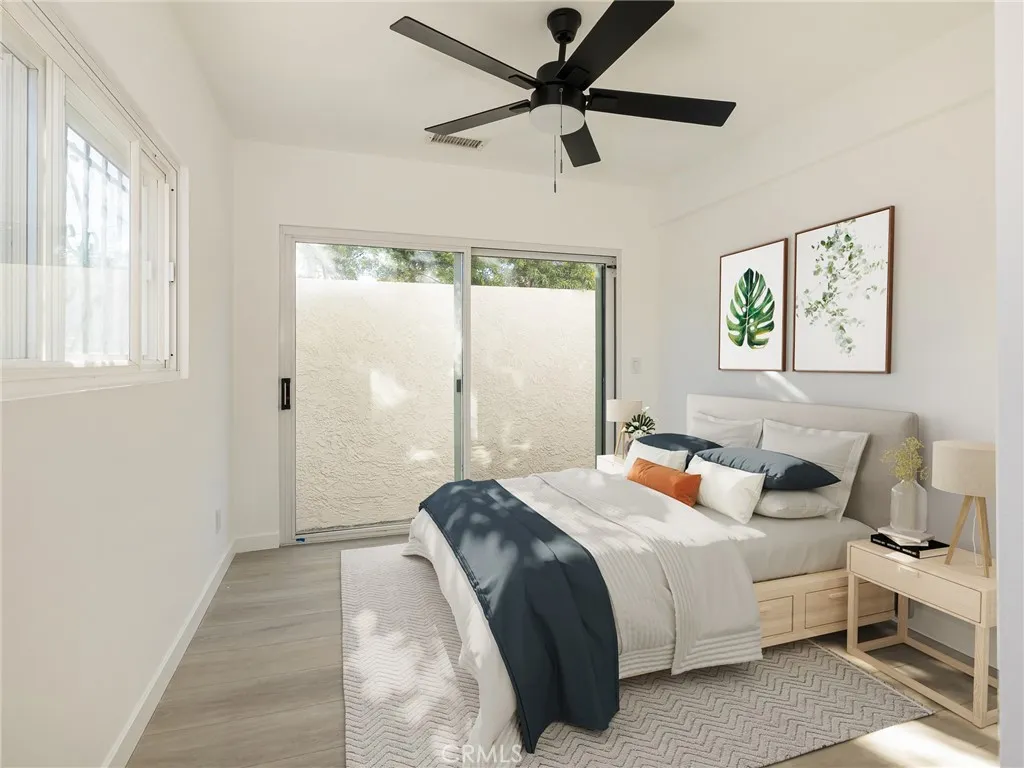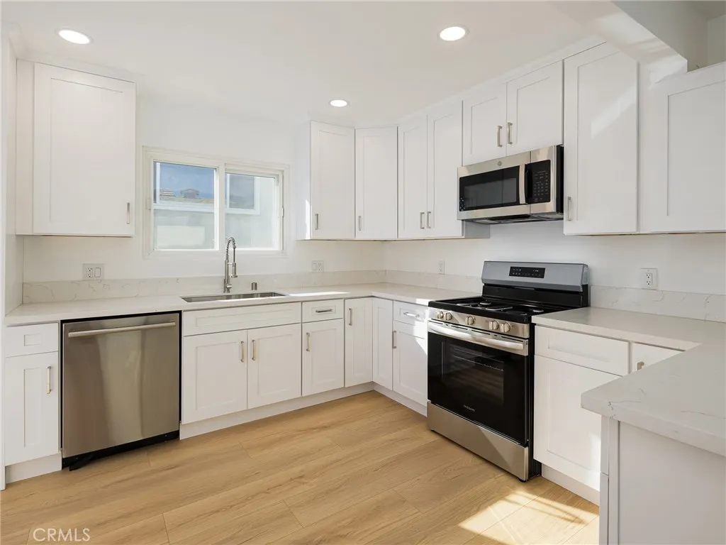 The 1 bedroom, 1 bathroom back unit spanning ~550 sqft also features new flooring, fresh paint, recessed lighting, a comfortable living area, one bedroom, and a three-quarter bathroom. The kitchen is equipped with a fridge and stove along with a microwave and dishwasher.