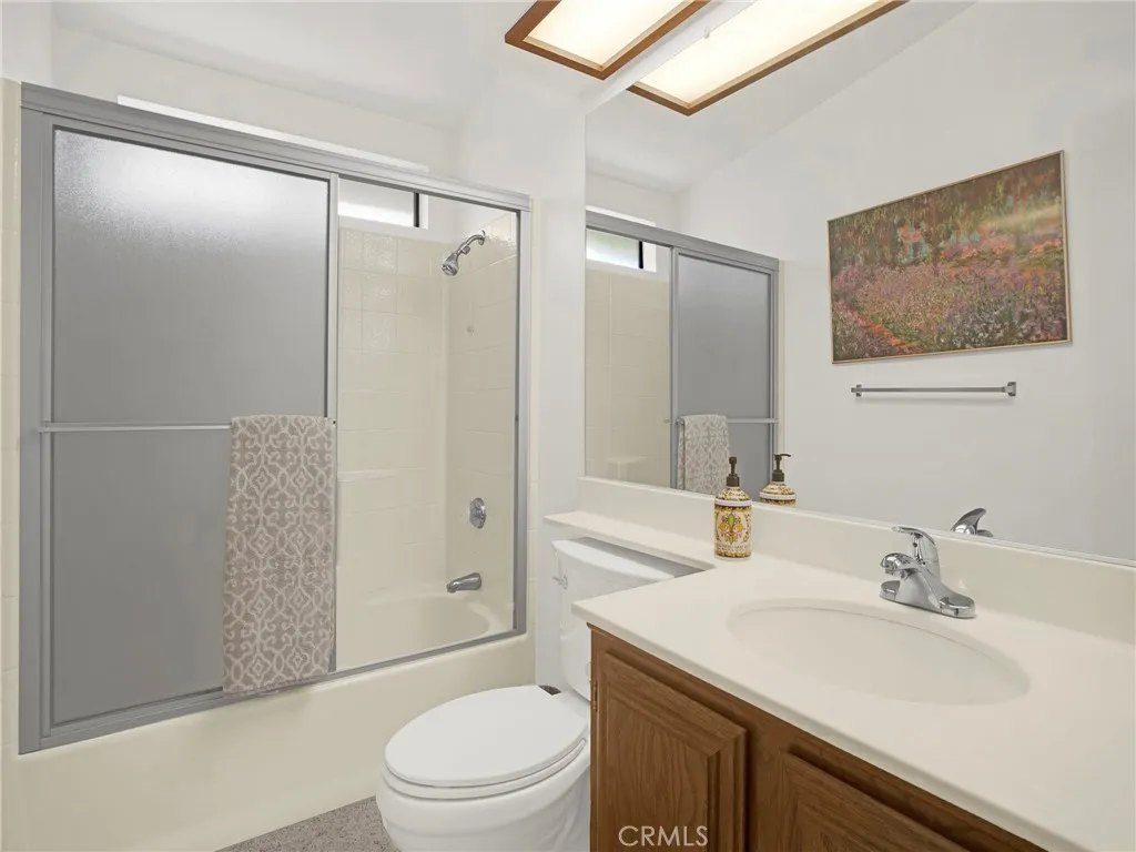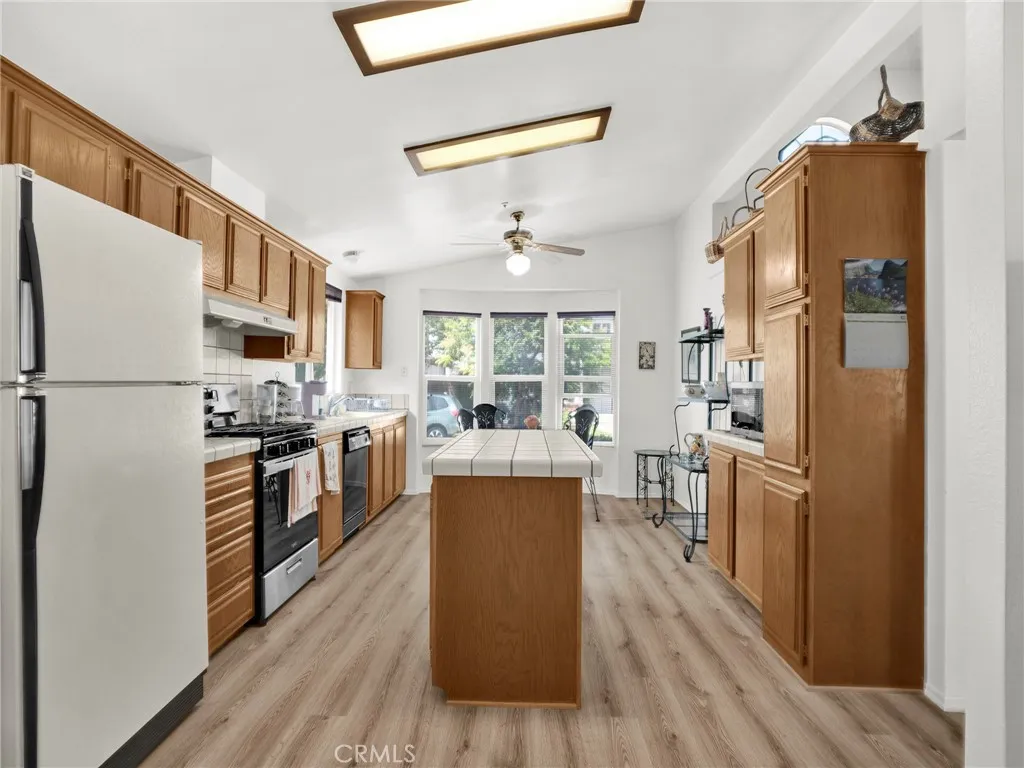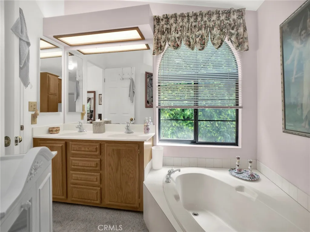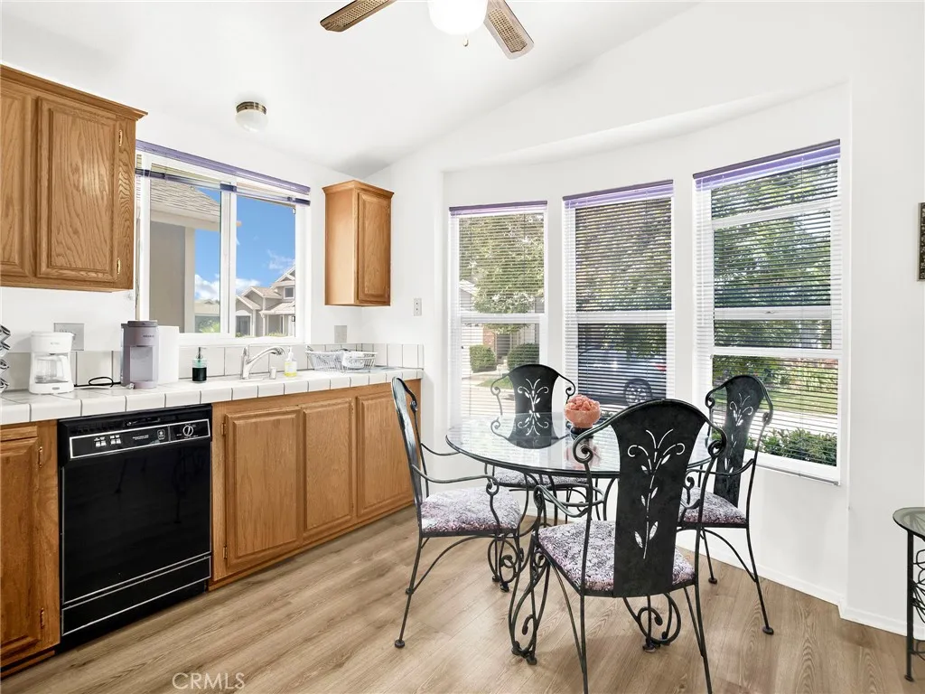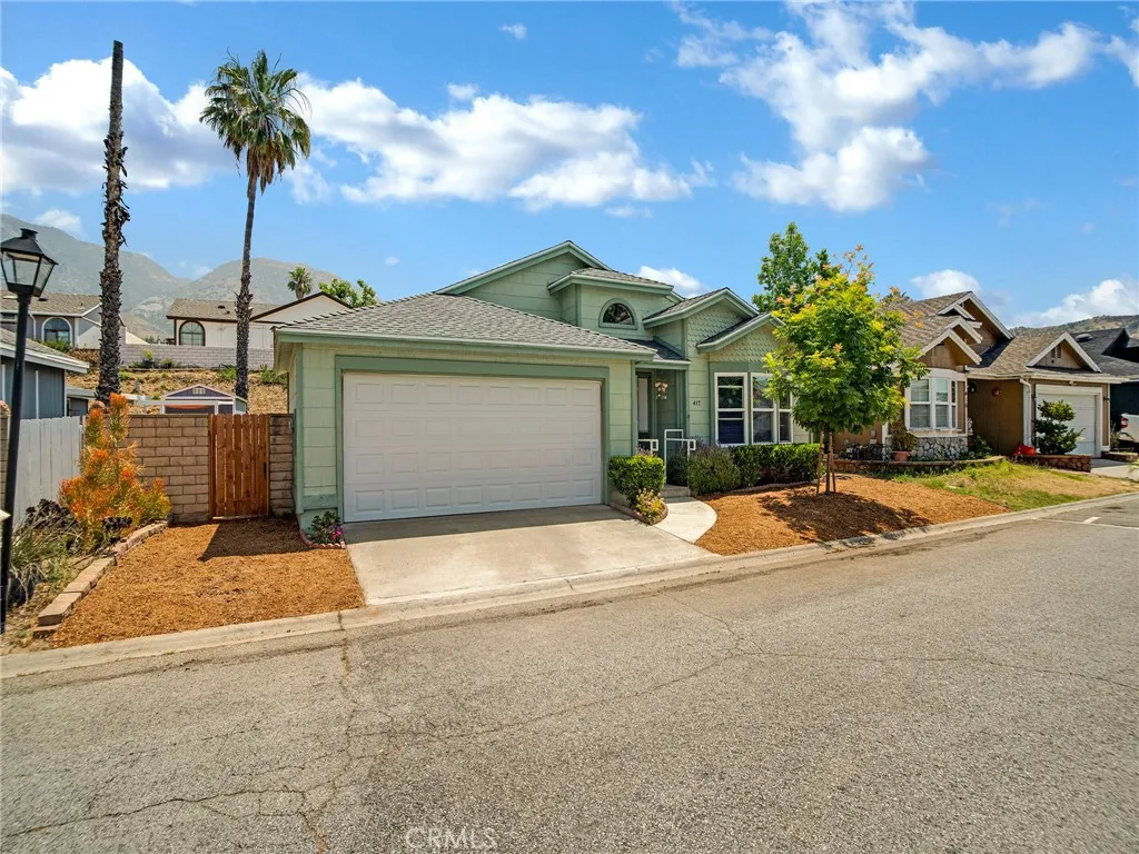 Welcome to this beautifully maintained 2-bedroom, 2-bathroom home in the highly sought-after Santiago Estates community! Step into a bright and open floor plan featuring vaulted ceilings, tile flooring in high-traffic areas, and laminate in the bedrooms and living spaces. The spacious kitchen offers generous cabinetry, a center island, and a cozy breakfast nook—perfect for casual mornings. Host guests in the adjoining dining area or unwind by the wood-burning fireplace in the inviting living room, which opens to a covered patio. The primary suite offers privacy and comfort with a walk-in closet, sliding doors to the backyard, and a spa-like bathroom with dual sinks, a soaking tub, and a separate shower. Outside, enjoy serene mountain views, a side yard, and ample space for outdoor gatherings. Additional perks include an indoor laundry room, a two-car garage with an electric roll-up door, and access to top-tier amenities: pool, spa, clubhouse, racquetball and basketball courts, playground, gazebo, and more. Located near the 210 freeway and scenic hiking trails—don’t miss the chance to make this your next home!