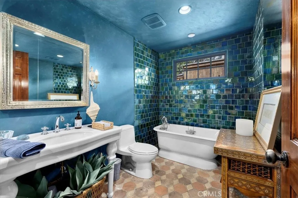 The spacious floor plan includes four bedrooms—three with their own private ensuite baths—and a versatile fourth room that adapts beautifully as a guest suite, office, or creative studio. Each of the five bathrooms boasts distinctive designs featuring imported tile and luxurious finishes.