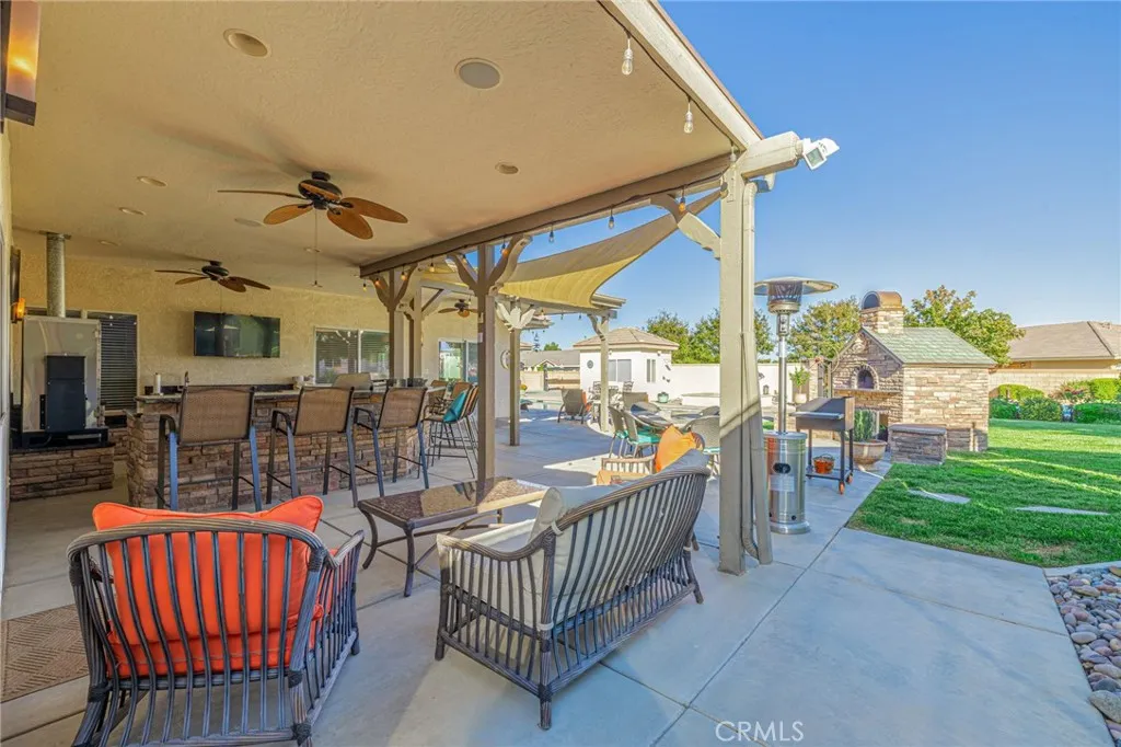 Five Star Resort Living! Tennis before breakfast and a swim after work -are just two of the exciting amenities found in this gorgeous property! Desert Rose Custom home w/ everything you can dream of! Elegant 5 bedroom, 4 bath single story home on 1 Acre +/- lot. Energy Efficient owned Solar system. This exclusive home offers a spacious floorplan with a soothing feel. Wide hallways, expansive rooms, custom upgrades everywhere you look. Large formal living rm, formal dining rm, open family rm. Excellent kitchen with center island and roomy pantry area. Double oven, 5 burner cooktop, large stainless steel refrigerator and all the amenities a home chef needs. The bedroom wing offers 4 sizable bedrooms, 2 full bathrooms plus the enormous double door entry master bedroom suite and tranquil master bathroom with jacuzzi tub. Large walk in organized closet and private door to the wonderful patio area. Moving on to the other exciting features of this home – The attached 4+ car super sized and insulated garage is truly a showplace. Epoxy floors, space saving cabinets & shelves and excellent lighting. You won’t believe how much space this garage offers. Plenty of paved driveway and RV parking area, Top of the line fully lighted tennis court plus a full size pickleball court. In-ground pebbletech pool with auto cover and lounge deck and luxurious spa. Detached Pool house with outdoor shower. Horseshoe pits. First class covered patio with the ultimate grillmasters entertainment area. The outdoor kitchen includes a smoker, BBQ, refrigerator, 2 burners, built-in sound system, mounted TV, ceiling fans and granite countertop bar that seats 8. Crowd pleasing Wood burning pizza oven imported from Italy with cultured rock exterior and copper roof. Plenty of room to relax and enjoy! Last but not least -the approx 1100sf detached guest house, 2 bed/2 bth, w/living rm & kitchen with oversized 2 c. gar and extra storage(originally permitted as garage and workshop). The list goes on & on!