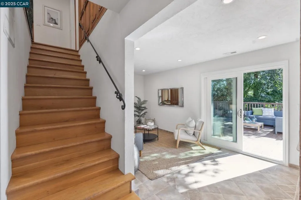 OH Saturday and Sunday, 1 to 4 PM – $350,000 price reduction from original $1,795,000 listing price! Nestled in Orinda’s Country Club neighborhood on a peaceful .3-ac lot, this enchanting 4BR/3.5BA home is a vibrant sanctuary for a family to thrive. Enjoy 2400+ sf of flexible indoor space—the central home, an ADU, and a modular office within magical gardens. The Central Home features HW floors and Euro double pane doors/windows, flooding the main floor with natural light. The master bedroom boasts ample closet space and ensuite bath with two add bedrooms, another full bath, and cozy family room downstairs. Prepare meals in the chef’s kitchen, gather in the sunny dining room, or dine al fresco on the spacious wraparound deck. And unwind in the living room or on the connected patio with views of the SW Oakland Hills. An ADU with a balcony provides flexible space—a guest suite for family/friends, a bedroom/playroom for kids, a home office, or rental unit. And a modular office with electricity offers a dedicated workspace for parents just steps from the main house. Relax amongst exotic gardens with palm trees and redwoods, flagstone pathways that lead to tranquil seating areas, and a lawn for play structures or vegetable beds.