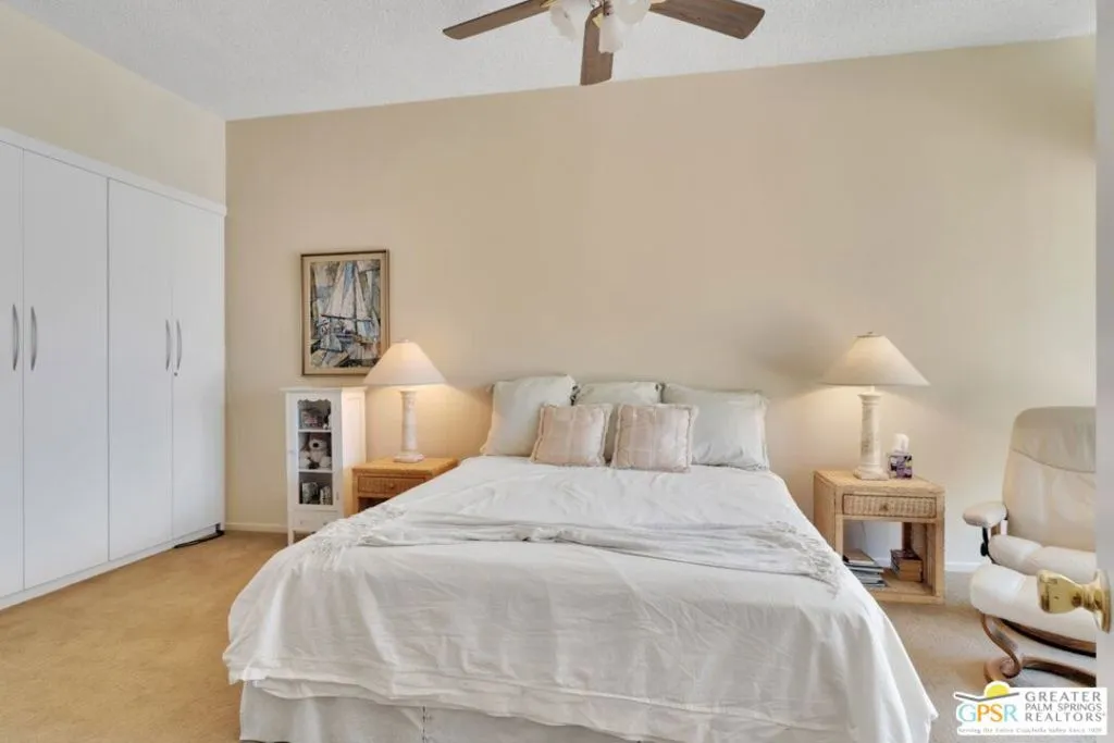 Step into timeless style and architectural significance in this stunning mid-century modern condo designed by renowned architect William Krisel. Spanning 2,239 square feet, this 3-bedroom, 3-bathroom residence beautifully blends classic design with contemporary comfort. Clean lines, soaring ceilings, and abundant natural light set the tone, while clerestory windows and signature Krisel angles highlight the authentic mid-century aesthetic. The expansive floor plan flows effortlessly from room to room, creating inviting spaces for both entertaining and everyday living. Brand-new dual-pane windows and sliders throughout enhance energy efficiency while preserving the home’s iconic style. The generously sized living area opens onto a private patio, perfect for relaxing or hosting guests under the desert sky. The kitchen is well-appointed with original architectural charm and modern upgrades, and each bedroom offers ample space and privacy ideal for guests or a home office setup. The primary suite is a true retreat with a wall of custom California Closets, en-suite bathroom, and direct access to outdoor living. Enjoy the convenience of in-unit laundry, plenty of storage, and a one car garage. Located in a celebrated community known for its architectural pedigree and serene setting, this home offers access to beautifully landscaped grounds, pools, and mountain views. Plus, you’re just minutes away from Palm Desert’s renowned shopping, dining, and cultural attractions. Don’t miss this rare opportunity to own a piece of mid-century history in one of Palm Deserts’ most iconic architectural enclaves.