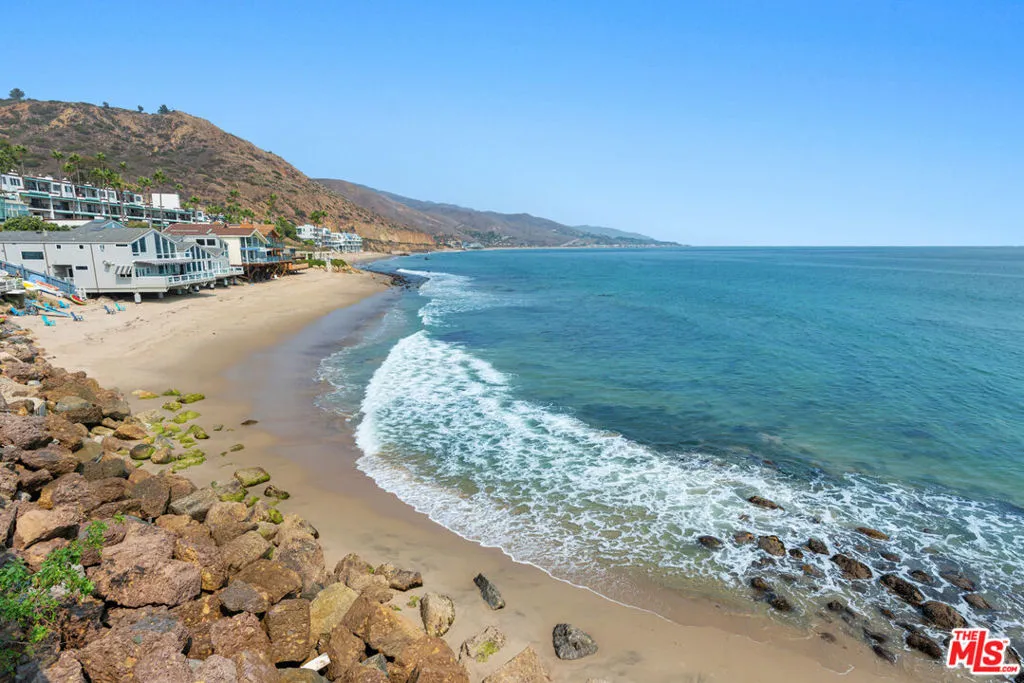 Updated contemporary on a double lot with rare 100 ocean frontage and a large landscaped lawn with hammock and a wood-and-glass sauna, perfect for lounging, dining, or working, and a detached guest room with a queen-sized bed and a 1/2 bathroom. A luminous entry hall to the surf break and non-stop ocean panorama, this stunning beach home with seamless indoor-outdoor flow, sensational views, and gorgeous open-plan design has everything you could possibly want for living the Malibu lifestyle. A private haven that is ideal for tranquil relaxation and sophisticated entertaining on a gorgeous cove with direct beach access, this special corner of paradise features wraparound decks, exceptionally high ceilings, skylights, enormous walls of glass facing onto the views, and beautiful wood floors. Step down from the entry to a sleek and sparkling great room with living, dining, and kitchen areas that open onto a beachfront deck through huge glass accordion doors, and to the entertainer’s deck at the side of the house. The living room area has built-in shelving, a ceiling fan, an enormous flat screen, and a chic hanging fireplace in the corner. The open kitchen has a large island with bar seating, marble countertops, quality appliances, and temperature-controlled wine storage. There is one bedroom and a bath on the entry-level and two ocean-view, en-suite bedrooms, and a laundry room on the upper floor. The majestic master suite is enormous, with exposed beams, two ceiling fans, a fireplace, built-in shelves, a huge custom closet, a spa-style bath, and a wall of glass opening onto a full-width oceanfront balcony with ample room for seating and star-gazing. Accessible from the kitchen and from the lower-level deck, the entertainer’s deck is furnished with a beautiful stone-clad outdoor kitchen and barbecue, a Jacuzzi brand spa, and ample seating and dining. Two steps down from the deck is a beachfront gravel area with additional seating, a fire pit, and steps leading to the beach. This amazing shoreline property also has air conditioning, automatic window shades, a speaker system, a carport, under-deck storage for surfboards and bikes, and breathtaking views over the mountains, coastline, ocean, and islands.