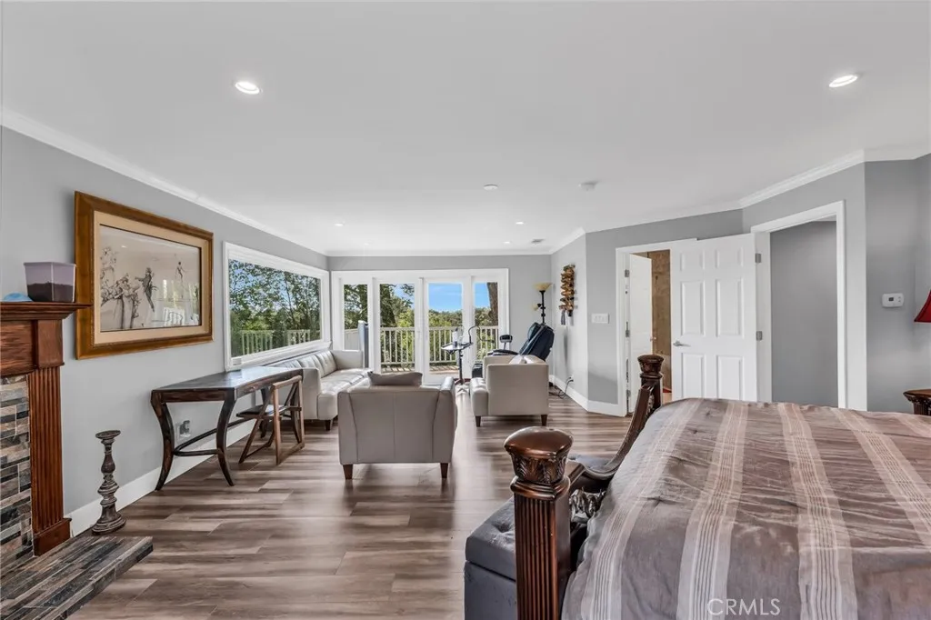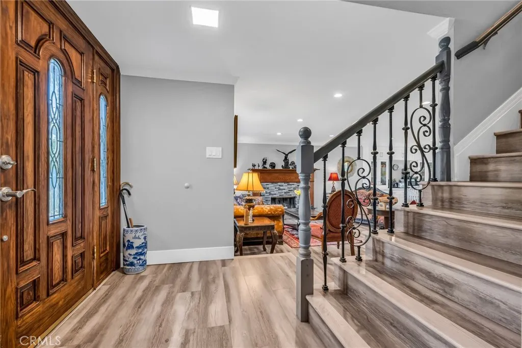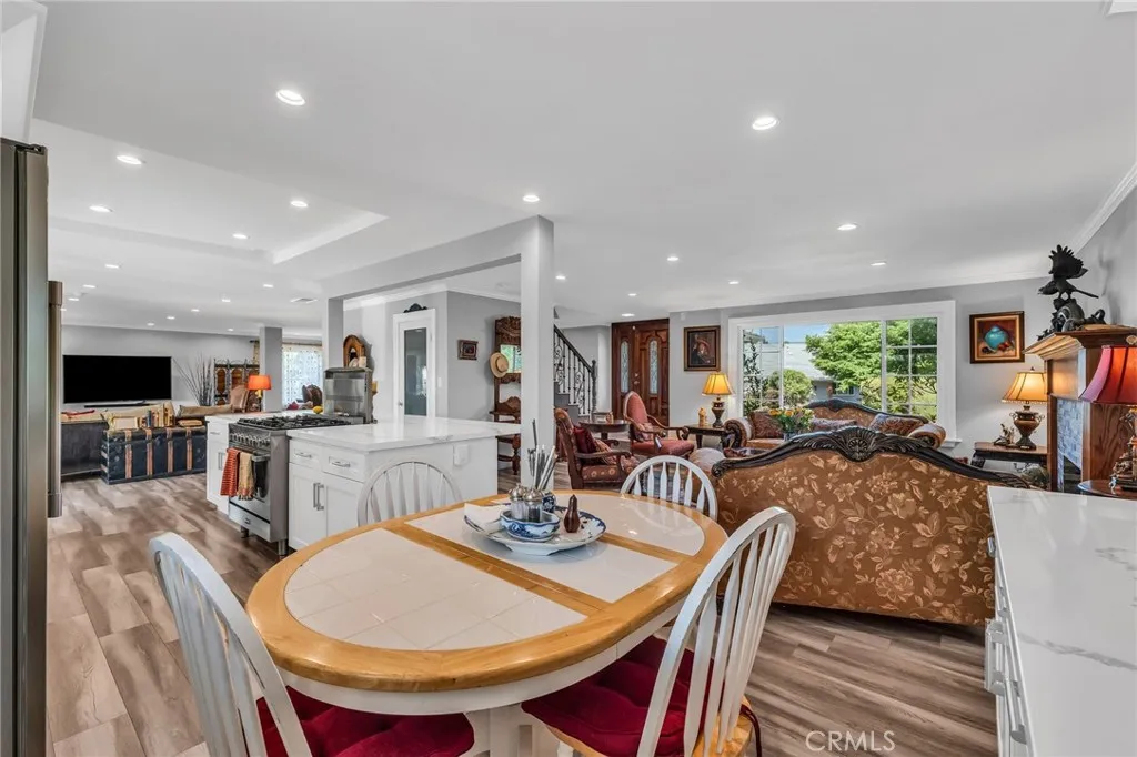 The spacious living room features a cozy fireplace and flows seamlessly into the dining area and a custom-designed kitchen, complete with top-of-the-line appliances, stylish cabinetry, premium fixtures, and elegant countertops.