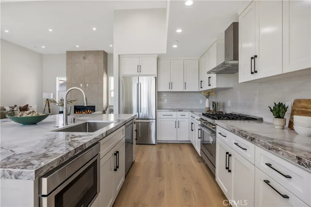 Step inside to be greeted by soaring vaulted ceilings, abundant natural light, and a thoughtfully designed open-concept floor plan—ideal for entertaining or relaxing in style. The expansive living area centers around a sleek fireplace and flows effortlessly into the dining space and a gourmet kitchen, featuring top-of-the-line appliances, custom cabinetry, and premium finishes that cater to the most discerning chefs.