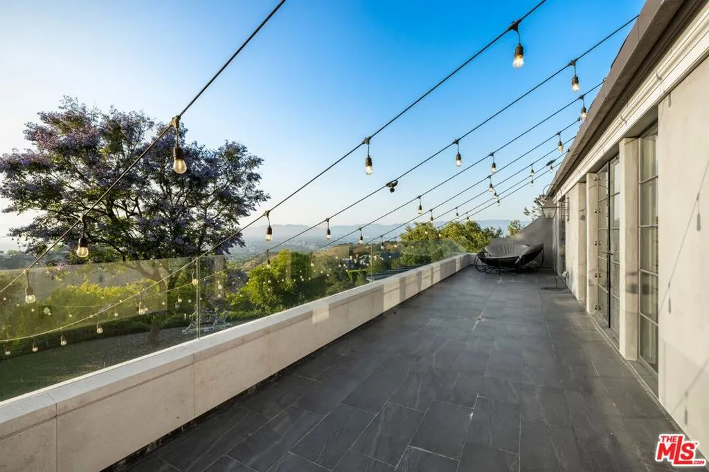 Experience ultimate exclusivity and unparalleled luxury in this French modern transitional. Located in Bel-Air’s Stone Ridge Estates situated in a guard-gated community of only 11 homes, the residence is positioned at the back of the private cul de sac optimizing breathtaking city views and privacy. A very rare combination of privacy, 24 hour gated security, a modern home with 180 degree city and mountain views in an estate setting with large grounds. Step inside and discover expansive open living spaces, tasteful finishes and a seamless blend of classic and modern design with wide plank wood floors throughout There is a causal sophistication which gives you the optionality to live relaxed on a daily basis and entertain a large group in a magical setting. The heart of this home is its open-concept family room flowing into a gourmet kitchen equipped with a double island, 60 inch La Cornue dual oven range with 9 burners and top-tier appliances. There is a quaint breakfast area overlooking the garden and a formal dining and living room, where large windows fill the home with natural light. There is an elegant office overlooking the views, a top of the line fitness center, a poker-game room or optional maids room. Move upstairs to the private spaces which are tranquil and quiet and an inviting corridor takes you into the grand primary suite which has a luxurious bathroom, a generously sized walk-in closet and a terrace overlooking the skyline. There are four more well-proportioned bedrooms upstairs including a junior primary suite and a cozy den on the landing. There is a secondary back staircase for convenience and a basement level with polished concrete floors which holds multiple wine refrigerators and has wall to wall built-in cabinetry to maximize storage. The enchanting grounds has sprawling lawns, beautiful gardens and citrus, pomegranate, Jacarandas, Sycamores and Oak trees. The magnificent pool and jacuzzi anchors the yard and soaks up the sunshine throughout the afternoon. There is an outdoor barbecue-kitchen area as well as numerous moments to chill around three fire pits and take in the views. When you are in the mood for movement and fitness there is a sports court, outdoor wellness area with an infrared sauna and cold plunge. This is a fully furnished lease (art excluded). Located near several private schools.