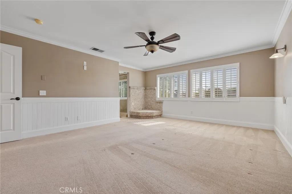Interior features include wood shutters, crown molding throughout, and Travertine flooring in the downstairs living areas. The kitchen is equipped with double ovens, a touch-activated faucet, and ample workspace.