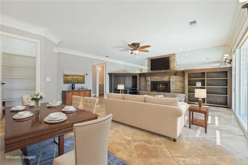 A new XL picture window and matching sliding glass doors in the second living room enhance the indoor/outdoor living, complete with custom electronic blinds. In the backyard to enjoy a custom pergola with fan and lighting, Pebble Tec pool and spa with Wi-Fi controls, a built-in BBQ, and a gas firepit—all surrounded by lush landscaping.