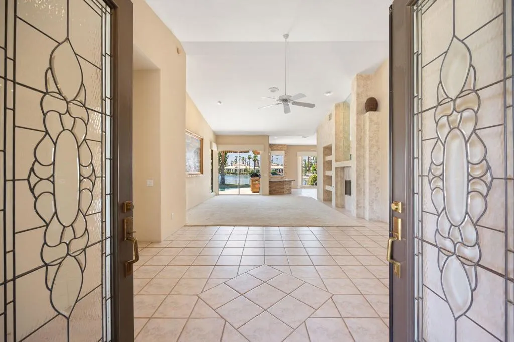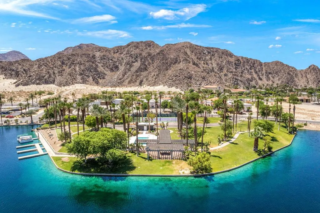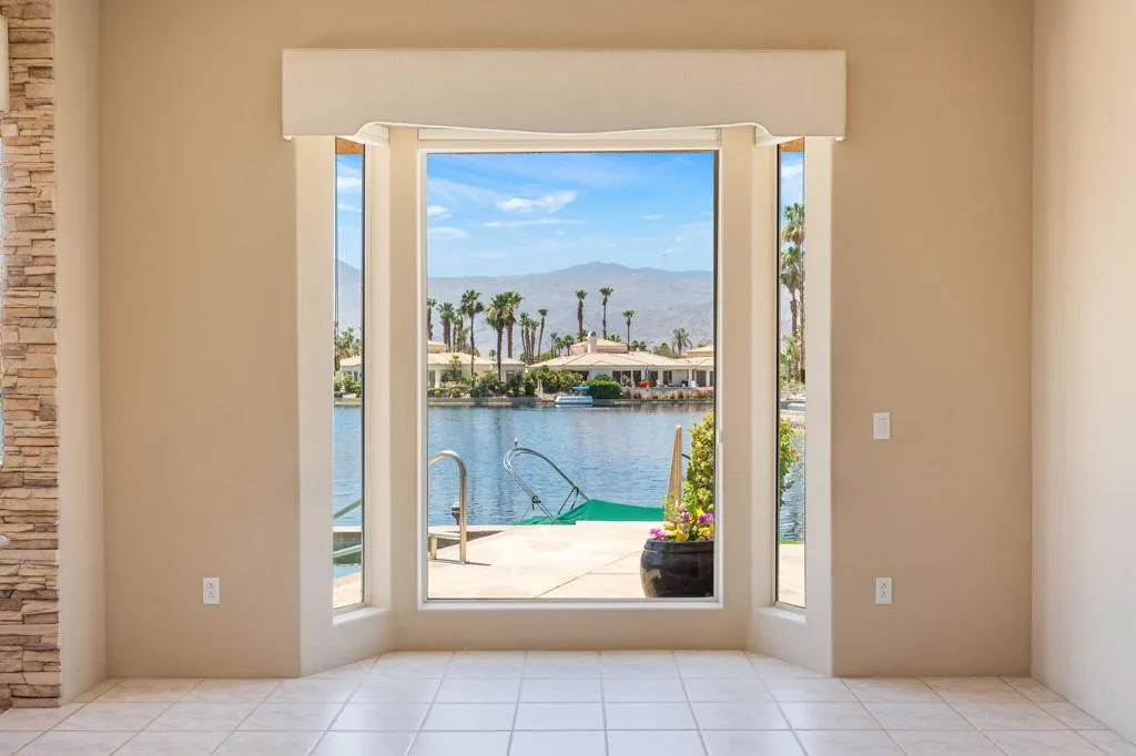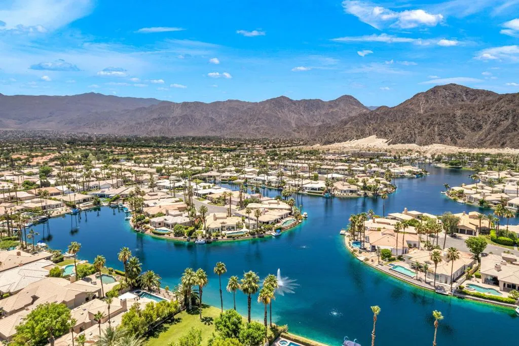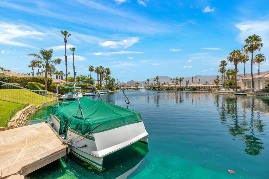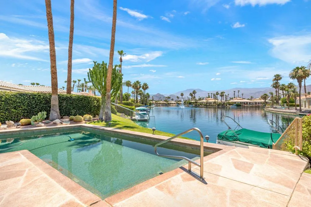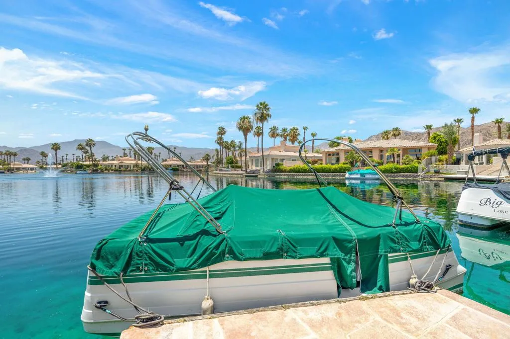 Lakeside – Don’t miss this rare opportunity for lakefront desert living! With stunning panoramic views of the Chocolate Mountains, this former model home is located in the highly sought-after gated community on Lake La Quinta. Every detail of this property exudes sophistication from its pristine lakefront setting to its meticulously-maintained landscaping. The well-thought-out design maximizes views, providing seamless indoor-outdoor living. It serves as a private sanctuary as well as an entertainer’s paradise with a full-sized wet bar, spacious kitchen, outdoor gas barbecue, pool, spa, and electric awning for enjoying the stunning views. Thanks to the private dock, you can cruise around the lake in your own boat. The beauty carries on inside. From your primary bedroom, continue to enjoy mountain and lakefront views with access to your outdoor patio. This room also includes a spacious ensuite bathroom with bathtub, shower, walk-in closet, toilet and separate bidet. Adjacent to the primary bedroom is a second bedroom with an attached bathroom. On the other side of the house is a third bedroom with its own private bathroom. The rooms are spacious yet easy to clean thanks to the central vacuum system. Faux painting on the walls, not wallpaper. A 25 acre community pool, tennis courts, bocce ball and more, a friendly neighborhood awaits. Resort style living with the best views on Lake La Quinta!