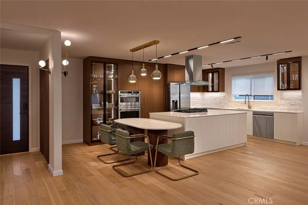 ** Very Motivated Seller** Nestled at the end of a tranquil cul-de-sac in the desirable community of Calabasas, this exquisite single-story residence offers an unparalleled sense of privacy and warmth, accentuated by stunning panoramic mountain views. The home’s refined European-inspired design aesthetic is evident in every carefully curated detail. The heart of the home is its custom-designed kitchen, featuring sleek, European-style cabinetry crafted from MDF with a sophisticated combination of laminate and matte lacquer finishes. Premium hardware and luminous white marble countertops and backsplashes create a space that is both visually elegant and exceptionally functional. This commitment to luxury extends to the bathrooms, where floors and walls are adorned with the timeless beauty of Calacatta Gold marble, imported from Italy. The home’s modern aesthetic is further enhanced by matte lacquered, frameless interior doors, which feature concealed hinges and magnetic handles for a seamless and sophisticated appearance.