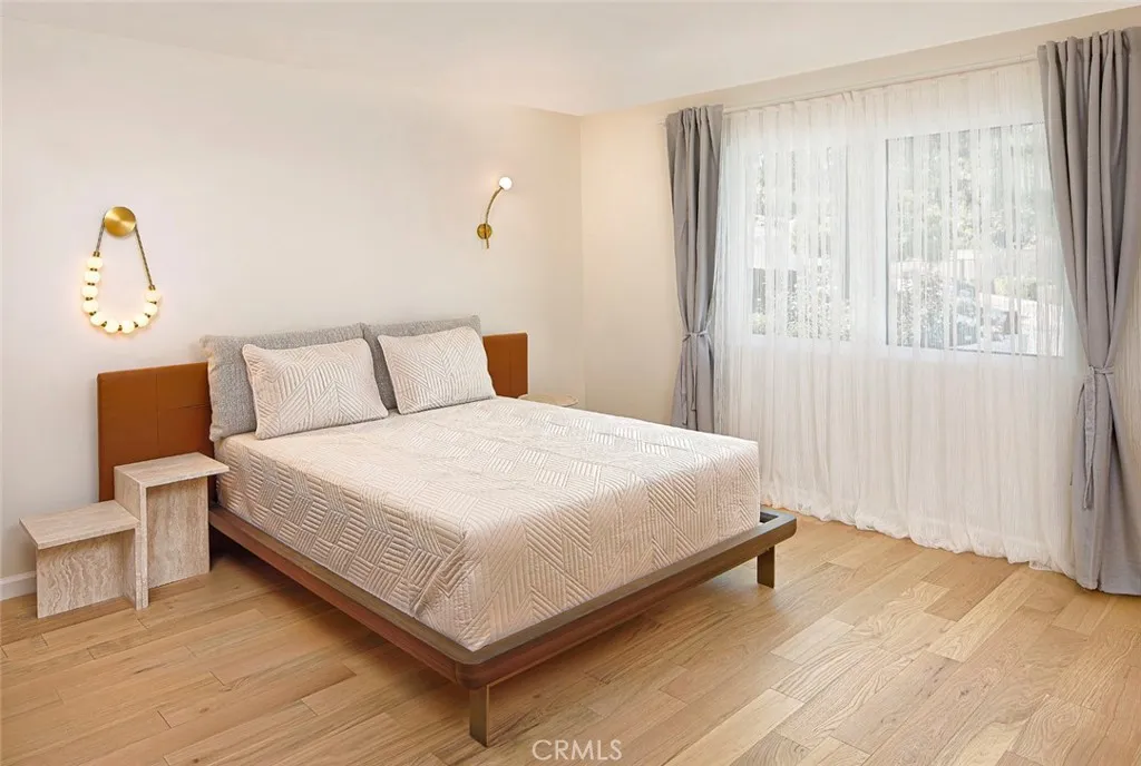 Both bedrooms and the hallway are equipped with integrated, contemporary European-style closets complete with interior lighting, offering ample and stylish storage. Engineered hardwood flooring flows cohesively throughout the residence, adding a touch of warmth and refinement. A focal point of the living area is the elegant fireplace, distinguished by its half-inch-thick, pencil-cut natural stone surround. Adjacent built-in shelving with dimmable LED lighting provides a perfect showcase for art and treasured belongings. Situated in a prime Calabasas location, this property affords convenient access to a wealth of amenities. Enjoy a scenic 20-minute drive to the world-renowned beaches of Malibu or explore the numerous natural hiking trails within Malibu Canyon. Furthermore, the residence falls within the acclaimed Las Virgenes Unified School District, with A+ rated Lupin Hill Elementary, A.E. Wright Middle School, and Calabasas High School all located within a one-mile radius.