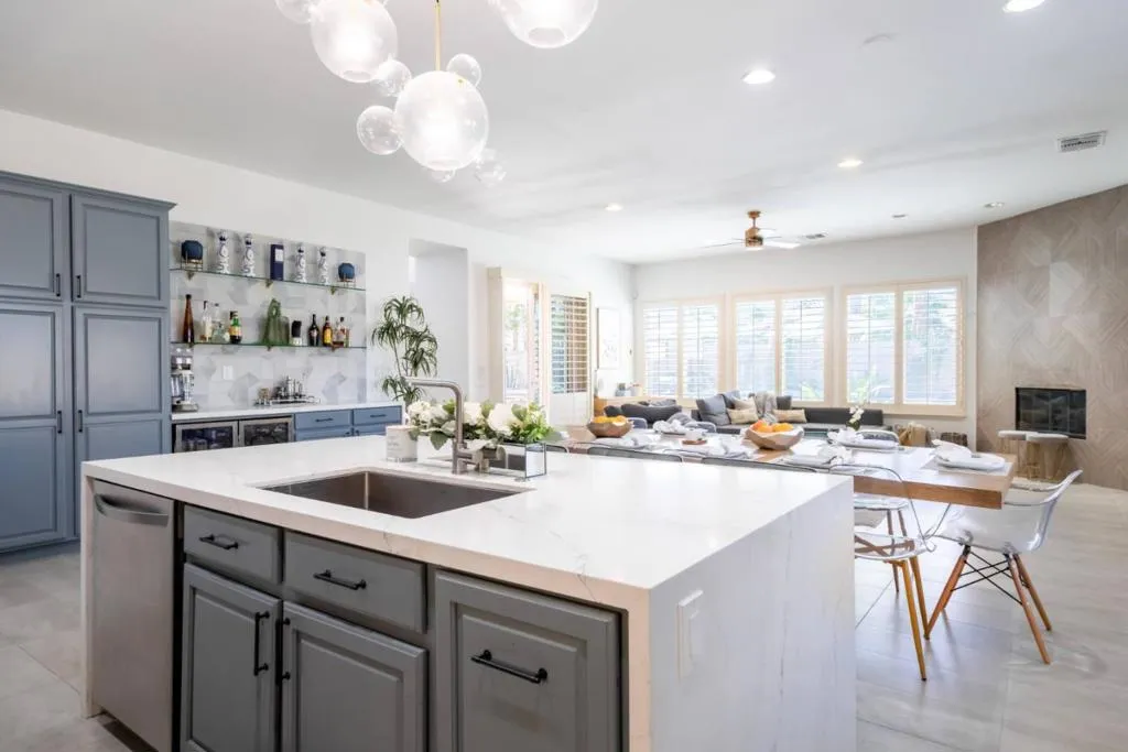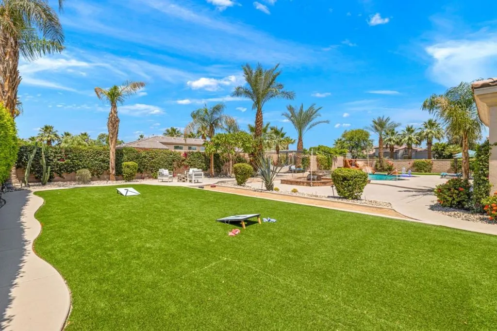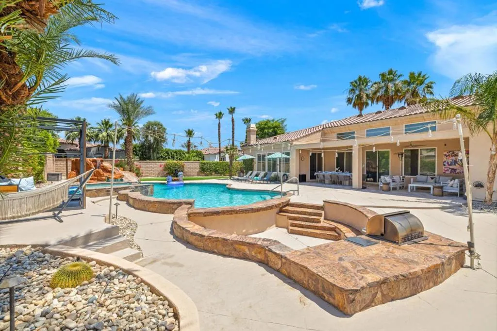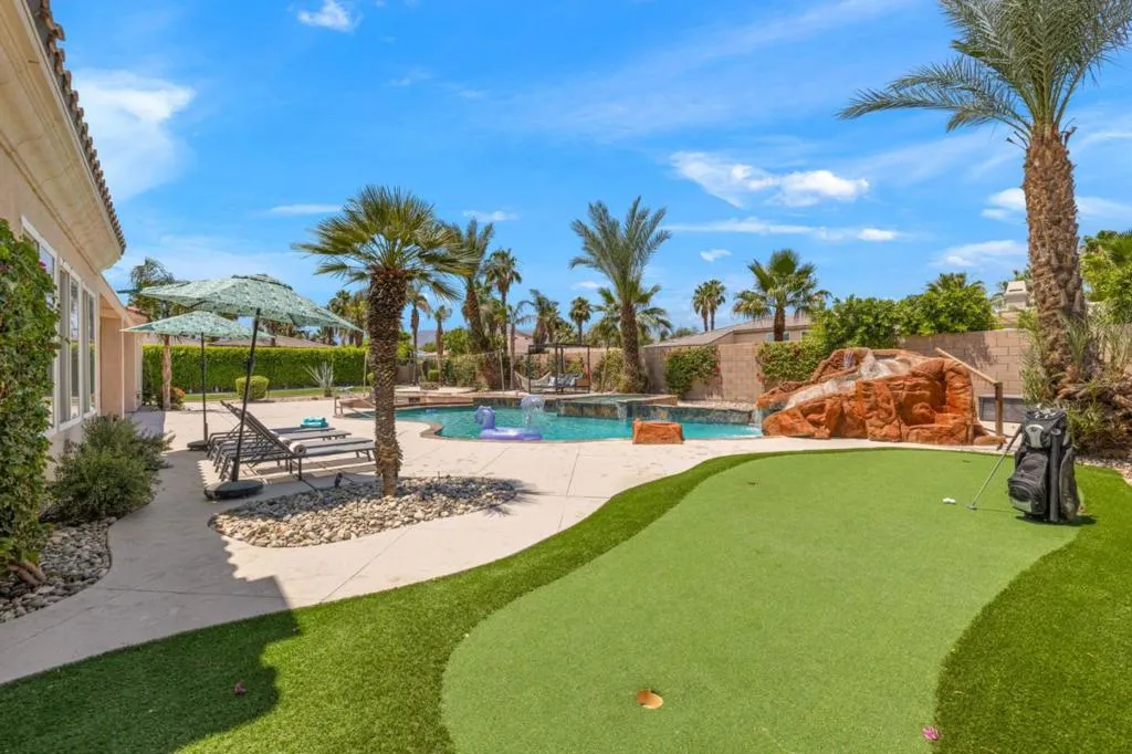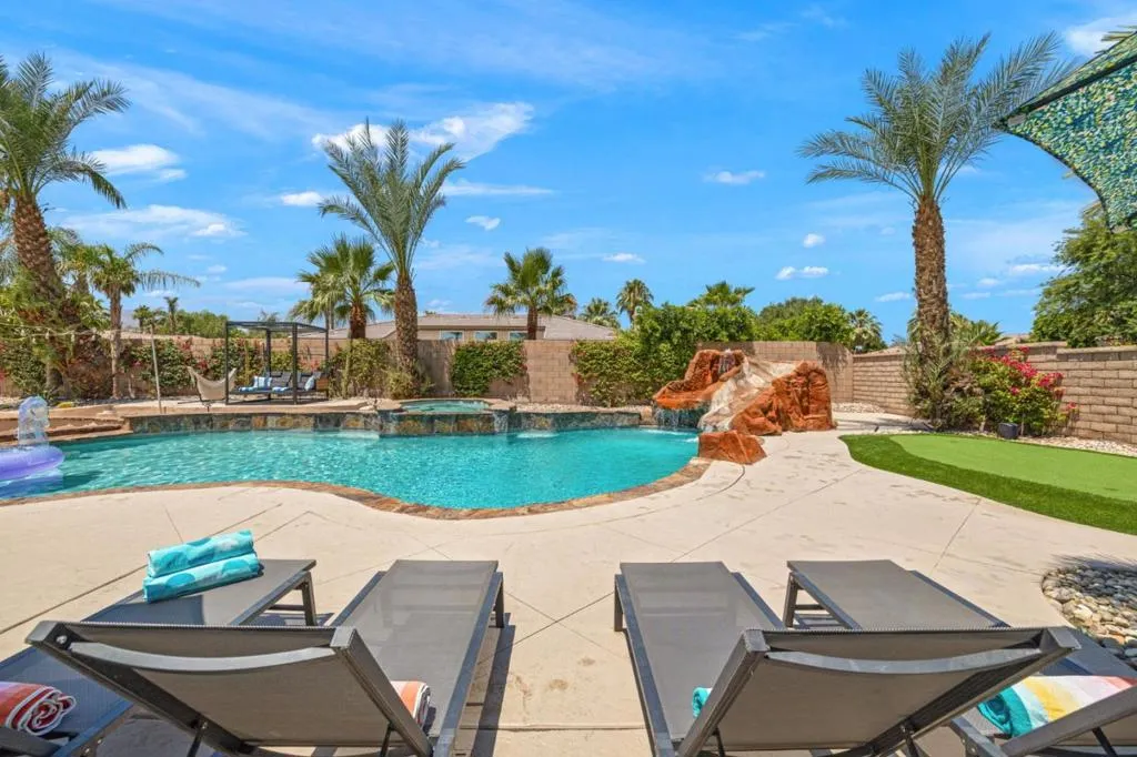 Desert Dream Oasis Resort Living at Home! Welcome to your turnkey desert retreat where luxury, comfort, and entertainment come together on a beautifully landscaped half-acre lot. This upgraded home blends open-concept living with soaring ceilings, natural light, new tile and wood flooring throughout. The chef’s kitchen is a showstopper, featuring high-end appliances, sleek countertops, and ample storage perfect for hosting or everyday living. Step outside to your private backyard resort, complete with a sparkling pool, spa, waterslide, outdoor kitchen, putting green, bocce court, and multiple areas to relax. The expansive primary suite is a serene escape with a spa-inspired bath, soaking tub, and a walk-in closet the size of a bedroom. Located in the sought-after gated community of Desert River Estates, this home offers a peaceful seclusion with easy access to shopping, dining, and recreation. Live everyday like you’re on vacation! Schedule a private tour today. Don’t Miss this one! Bonus – ALL Furnishings included!