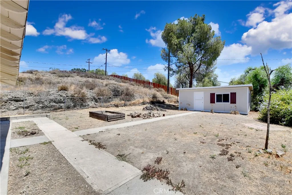 This single story Menifee home offers 1050 square feet of living space with three bedrooms, one bathroom, and a single car garage, all situated on a spacious 9583 square foot lot. The backyard also features a detached workshop, perfect for projects, storage, or creative space. Inside, the spacious living room takes center stage, boasting a cozy brick fireplace and an abundance of natural light from the windows and access the backyard through the sliding glass door, perfect for indoor-outdoor living. To the left of the entry, a hallway leads to a wall of cabinets for extra storage, two bedrooms, each offering laminate flooring, ceiling fans, ample closet space with sleek sliding mirrored doors, and plenty of natural light through the windows. Also along the hallway is a full bathroom featuring a shower tub combo, single sink vanity, and tile flooring, as well as a convenient laundry room equipped with built-in cabinets for added storage and functionality. The bright and spacious kitchen showcases granite countertops, and stainless steel appliances including a 4 burner electric cooktop and oven, range hood, and dishwasher. Just beyond the kitchen, the master bedroom includes laminate flooring, a ceiling fan, Ample closet space with sleek sliding mirrored doors and a sliding glass door leading to the covered backyard patio. The backyard offers a spacious, blank canvas ready for your personal vision, complete with a covered patio for outdoor relaxation and a detached workshop, perfect for storage, hobbies, or DIY projects. This home is conveniently located near shopping centers, freeways, and highways, this home offers the perfect blend of comfort and accessibility.