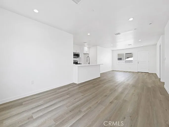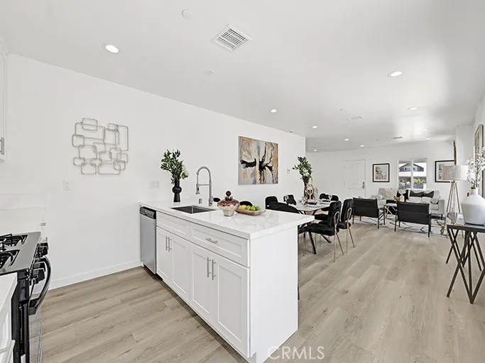 The front main unit spans approximately 1,200 square feet and features three bedrooms and two bathrooms. The second unit, permitted under SB9, mirrors the same footprint and offers three bedrooms and three bathrooms. The detached ADU provides an additional 800 square feet with two bedrooms and two bathrooms. Each unit has been thoughtfully designed with white shaker cabinets featuring soft-close drawers and doors, sleek quartz countertops, and brand-new stainless steel appliances. Interior finishes include luxury vinyl plank flooring throughout, along with washer and dryer hookups equipped for both gas and electric options.