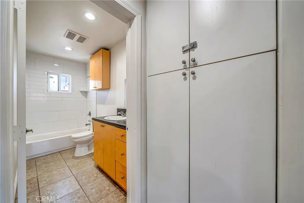 The open kitchen features sleek granite countertops, ample cabinet storage in warm natural wood tones, and appliance including a gas stove. Overhead recessed lighting and a large window by the sink keep the space light and airy, making it ideal for everyday cooking and entertaining. The bedroom is generously sized with tile flooring throughout, a large window for natural light, and a built-in wall A/C unit for added comfort. You’ll love the extensive built-in closet system featuring drawers, cabinets, and hanging space — perfect for staying organized. The bathroom is clean and well-appointed with a subway-tiled shower/tub combo, granite vanity counter, and modern fixtures. The warm wood cabinetry provides extra storage while keeping the space inviting.