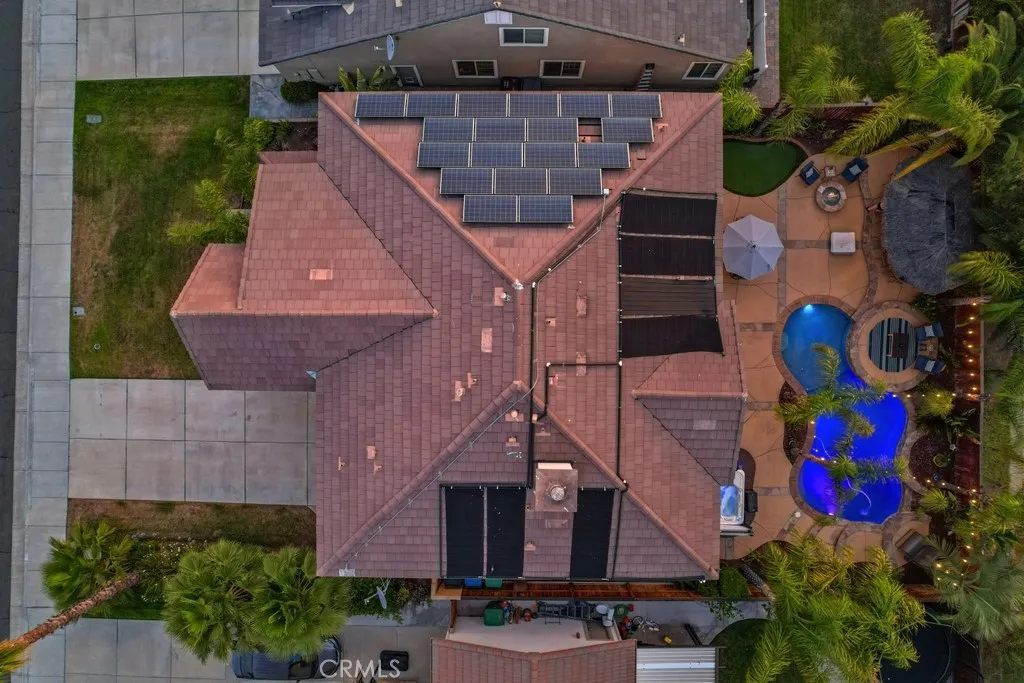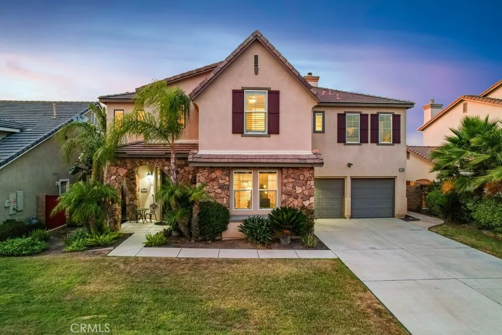 ** ATTENTION VA BUYERS, 2% ASSUMABLE VA LOAN!! Luxurious 5-Bedroom Entertainer’s Paradise with Pool and Spa. Welcome to your dream home! This stunning 5-bedroom, 3,752 sq ft residence is the ultimate entertainer’s retreat, featuring a solar-heated saltwater pool, above-ground spa, Palapa bar and BBQ. Enjoy the California lifestyle in your backyard oasis, complete with a gas fire pit and putting green. Inside, you’ll find high ceilings, elegant crown molding, hardwood floors, and plantation shutters throughout. The spacious great room boasts a cozy fireplace and a built-in entertainment center, creating a warm and inviting space for relaxing or hosting guests. The chef’s kitchen is equipped with granite countertops, a custom tile backsplash, double ovens, stainless steel appliances, and tile flooring. A downstairs bedroom with a closet and dedicated exercise area offers flexibility for a home office, gym, or guest retreat, perfect for today’s versatile lifestyle. Upstairs, the double-door entry leads into a luxurious primary suite featuring dual walk-in closets, dual vanities, a relaxing soaker tub, and a spacious layout perfect for unwinding. The open loft serves as a library and sitting area, overlooking the living space below, while a spacious guest suite offers privacy with its own full bath. Ceiling fans throughout the home ensure comfort in every room. This home is truly a one-of-a-kind opportunity—luxury, comfort, and entertaining all in one perfect package. **Bundled service pricing available for buyers**