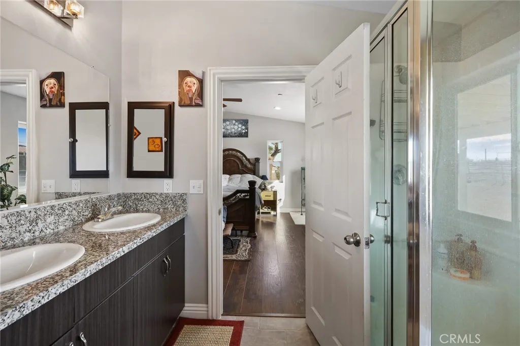 The open-concept layout includes vaulted ceilings and a spacious kitchen equipped with custom cabinetry, granite countertops, stainless steel appliances, and recessed lighting. The living area includes a fireplace with a raised hearth, ideal for a cozy atmosphere. The primary suite offers a large walk-in closet, dual vanities, a soaking tub, and a walk-in shower. Three additional bedrooms are located on the opposite wing of the home, along with a full guest bathroom. Other interior features include luxury vinyl plank and tile flooring, mirrored closet doors, a finished garage, a dedicated laundry room with storage, and a tankless water heater.