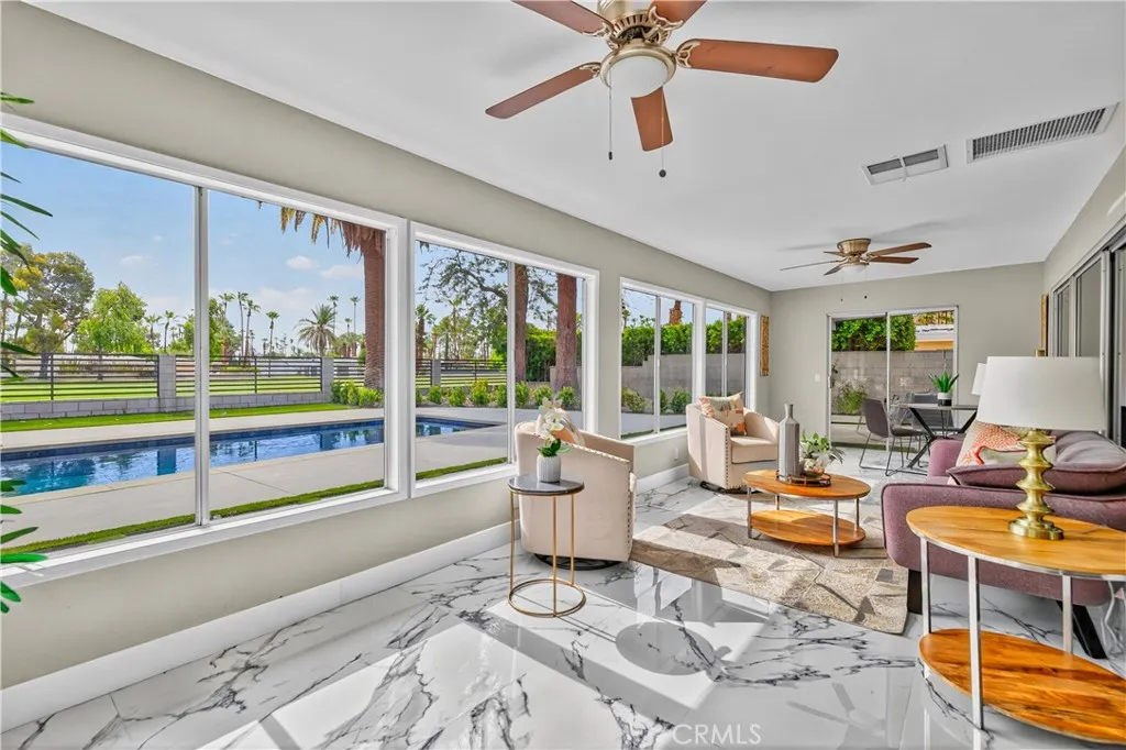 Vaulted ceilings and an open, airy design welcome you as you enter, drawing your eye straight through to the gorgeous backyard oasis. The home also includes a large, enclosed California room, ideal for morning coffee or evening cocktails while soaking in the desert beauty.