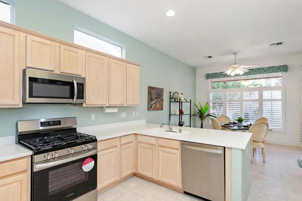 SUN CITY Palm Desert – THIS IS THE BEST BUY EVER! 2 bedroom, den and 2 bath in the main PLUS a 1 bedroom 1 bath CASITA! (TOTAL 2100 sq A VERY UNUSUAL FIND! This home is located in a quiet area of Sun City and is a very low maintenance property! BOTH A/C AND WATER HEATER have been REPLACED! When entering the home you will be greeted with an expansive wall of glass viewing a gorgeous back patio with a wall of bouganvillea that has the ultimate privacy! Primary bedroom is on right side of home with a huge bath area with enlarged shower, dual sinks, lovely countertops, linen closet and a custom closet. Primary bedroom has a huge window with views of the mature landscaping and olive and lemon trees in the private patio. Secondary bedroom on the opposite side of the home has a bathroom available to it nearby, which incudes a stall shower/tub combo , corian counters and new hardware. The AC has been replaced and maintained by Right Away AC. The Casita has a separate unit that has hardly been used.This model is very special with the extra storage designed within the floor plan. There is a ”dry bar” cabinet area along with additional cabinets near the kitchen along with a linen closet in the primary bedroom. The kitchen is very ”light and bright” with tons of windows and clearstory windows. Corian counters with ALL APPLIANCES recently updated with Frigidaire Gallery Stainless Steel models. There is a very large eating area with views to the patio. This model has an additional open den/office area, which could be converted to a 3rd bedroom within the main home. There is also the convenience of an inside laundry room and plenty of space in the garage for storage. In addition to the main home, there is a charming separate casita which includes a bedroom area and its own bath. It includes a microwave, sink and cabinets A Custom closet is also available. Enjoy as a separate office area, or a tranquil retreat for your guests or grandchildren. Everyone loves having the flexibility of a casita! The garage is available for your two cars, storage cabinet and storage racks. The extended 2 car garage has a nook for golf cart parking. This pristine home your own within one of the top retirement communities in the USA according to Money Magazine! You will have a safe, securely gated community with 2 golf courses, pro shops, driving range, pitching and chipping practice areas and an 18 hole putting course!