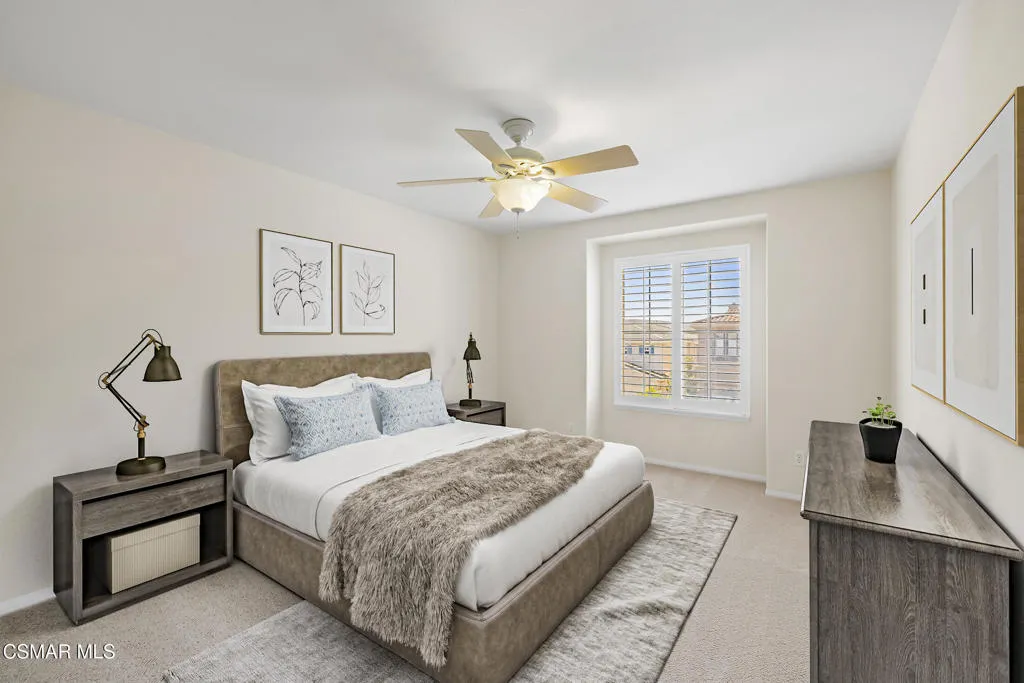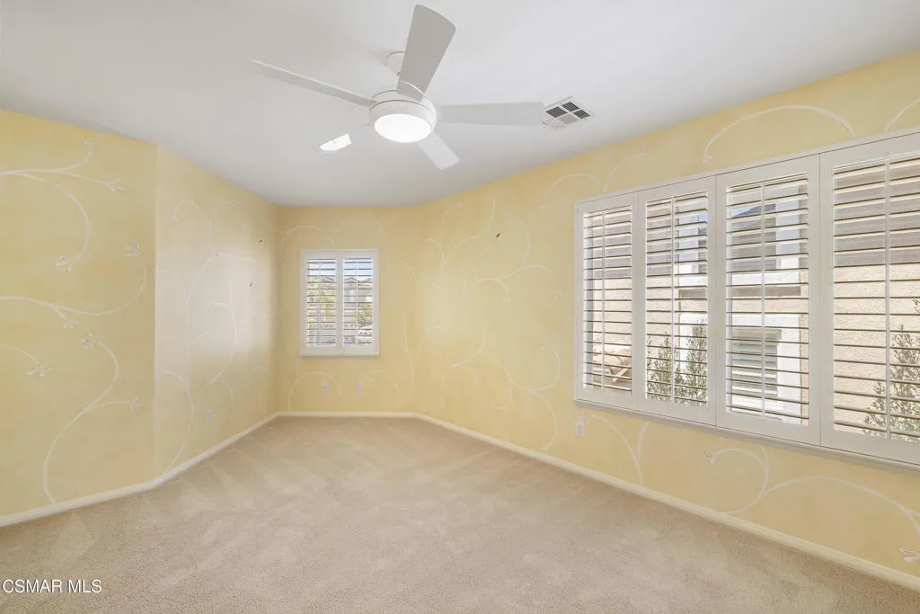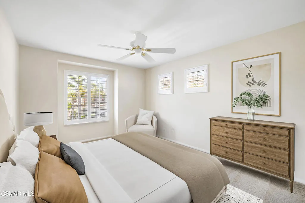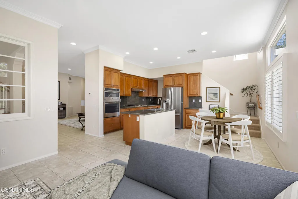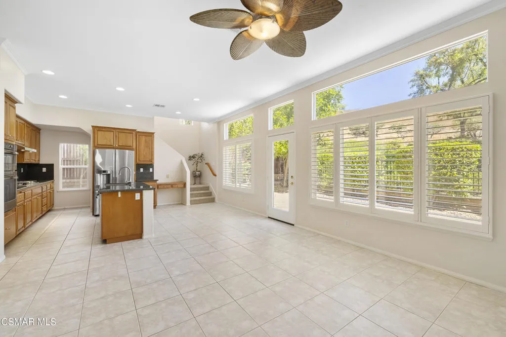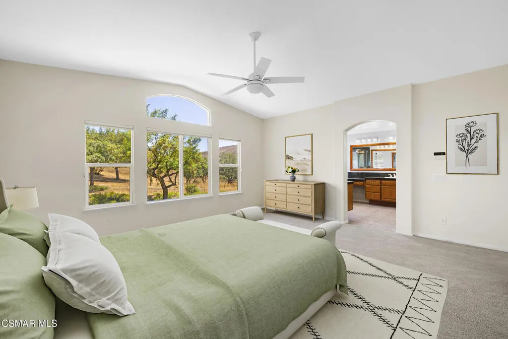 Welcome to this highly desirable Plan 3 Bellagio home, located in the prestigious gated community of Eagle Ridge in Lang Ranch. Situated on a cul-de-sac street with picturesque views of the surrounding hills, this unique floor plan with a dual staircase is also the only model in the community that offers a full 3-car garage. The open layout features spacious living and dining rooms–ideal for entertaining–that flow seamlessly into a bright family room with a fireplace. Beautifully appointed kitchen includes an office nook/landing station, maple cabinetry, granite countertops, a center island, stainless steel appliances (including the refrigerator), a walk-in pantry, and serene views of the private backyard and open space. The optional downstairs (5th) bedroom is currently utilized as a fully equipped home office with custom built-ins. A full bathroom with a shower is also located on the main level. Upstairs are three generously sized secondary bedrooms, each with ample closet space, including one with a walk-in closet. There is a hall bathroom featuring a dual-sink vanity and a tub with shower. The luxurious primary suite boasts sweeping views and a spacious ensuite bathroom with dual vanities topped with granite countertops, a soaking tub, a granite-tiled shower with a frameless glass enclosure, and an expansive walk-in closet with custom built-ins. A dedicated upstairs laundry room includes a sink, washer, and dryer. Additional highlights include community pool, spa, and playground. Enjoy easy access to nearby parks, miles of hiking and biking trails, shopping, and award-winning schools. This is a rare opportunity to own a one-of-a-kind home in one of Lang Ranch’s most coveted neighborhoods!