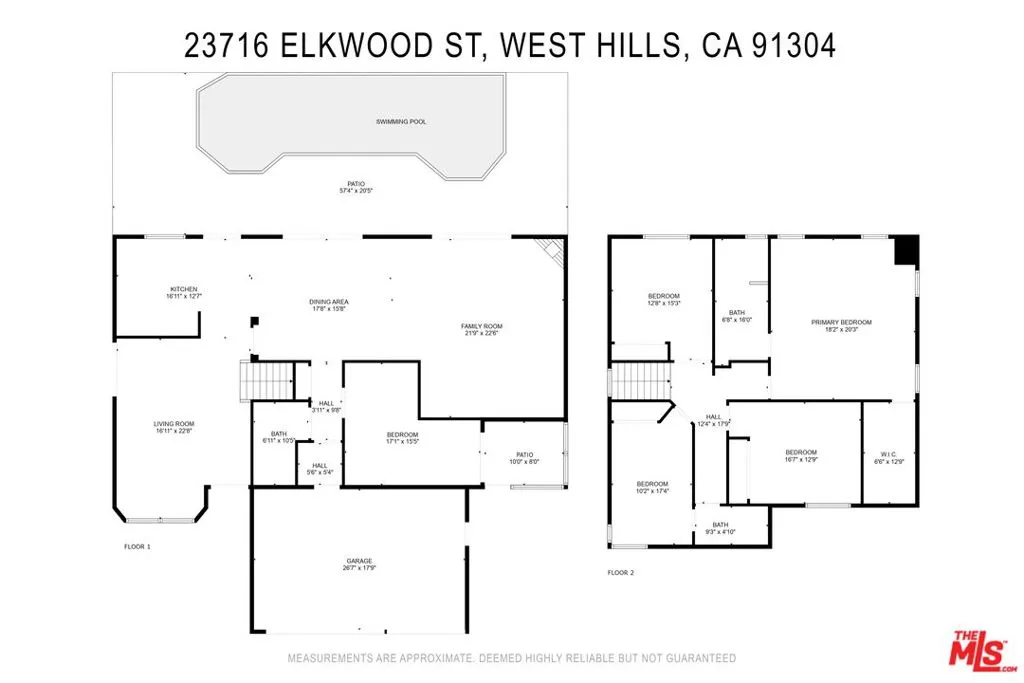 Welcome to 23716 Elkwood Street! Located on a beautiful cul-de-sac in the highly desired West Hills neighborhood. Rare home with 5 bedrooms and 3 bathrooms. Enter into a formal living room with high ceilings. Updated kitchen with Viking appliances, breakfast bar and French doors that lead to the backyard. A large dining room / family room with brick accented fireplace perfect for entertaining guests. One bedroom and bathroom, and direct access to the 3 car garage completes the first floor. Upstairs you will find 4 well sized bedrooms, including the primary with en suite bathroom and walk-in closet. A guest bathroom completes the upstairs. Step outside into the private backyard oasis with pool and spa. Additional features of this home include central AC/heat, recessed lighting throughout, new duct work installed in the past year and a new furnace. Located close to a luscious park and a short distance to Topanga Mall, the Warner Center and more!