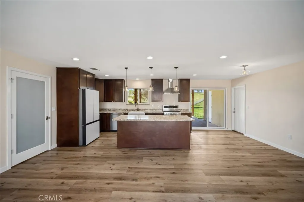 Inside, the four-bedroom, two-bathroom home unfolds with an airy, open-concept design, seamlessly connecting the kitchen, living, and dining spaces. Thoughtfully updated, the kitchen is both elegant and functional, featuring endless counter space, a large island, a walk-in pantry, and modern cabinetry, countertops, and appliances. Natural light pours in from every angle, enhancing the effortless flow and inviting ambiance throughout.